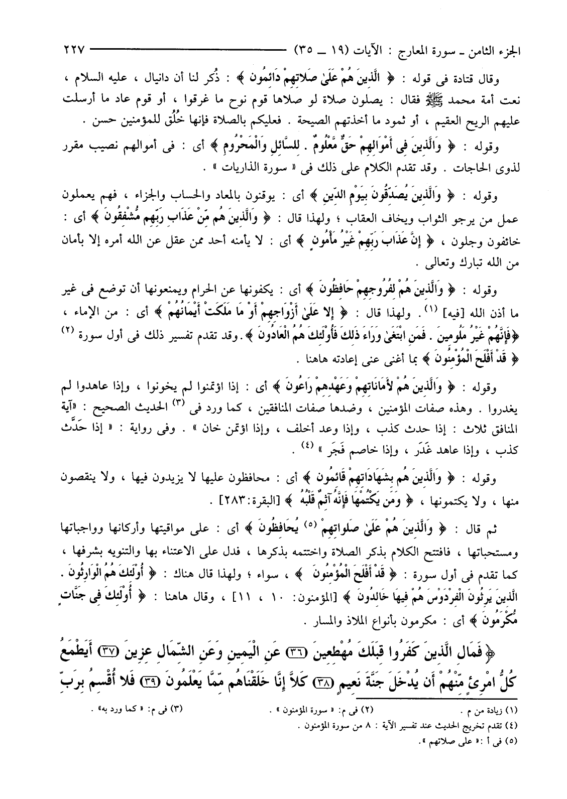 ثُمَّ قَالَ: {وَالَّذِينَ هُمْ عَلَى صَلاتِهِمْ يُحَافِظُونَ} (5) أَيْ: عَلَى مَوَاقِيتِهَا وَأَرْكَانِهَا وَوَاجِبَاتِهَا وَمُسْتَحِبَّاتِهَا، فَافْتَتَحَ الْكَلَامَ بِذِكْرِ الصَّلَاةِ وَاخْتَتَمَهُ بِذِكْرِهَا، فَدَلَّ عَلَى الِاعْتِنَاءِ بِهَا وَالتَّنْوِيهِ بِشَرَفِهَا، كَمَا تَقَدَّمَ فِي أَوَّلِ سُورَةٍ: {قَدْ أَفْلَحَ الْمُؤْمِنُونَ} ؛ سَوَاءٌ لِهَذَا قَالَ هُنَاكَ: {أُولَئِكَ هُمُ الْوَارِثُونَ الَّذِينَ يَرِثُونَ الْفِرْدَوْسَ هُمْ فِيهَا خَالِدُونَ} [الْمُؤْمِنُونَ: 10، 11] وَقَالَ هَاهُنَا: {أُولَئِكَ فِي جَنَّاتٍ مُكْرَمُونَ} أَيْ: مُكْرَمُونَ بِأَنْوَاعِ الْمَلَاذِّ وَالْمَسَارِّ.