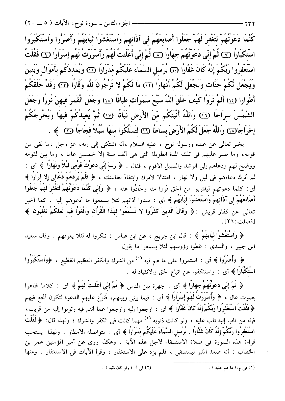 يُخْبِرُ تَعَالَى عَنْ عَبْدِهِ وَرَسُولِهِ نُوحٍ، عَلَيْهِ السَّلَامُ، أَنَّهُ اشْتَكَى إِلَى رَبِّهِ، عَزَّ وَجَلَّ، مَا لَقِيَ مِنْ قَوْمِهِ، وَمَا صَبَرَ عَلَيْهِمْ فِي تِلْكَ الْمُدَّةِ الطَّوِيلَةِ الَّتِي هِيَ أَلْفُ سَنَةٍ إِلَّا خَمْسِينَ عَامًا، وَمَا بَيَّنَ لِقَوْمِهِ وَوَضَّحَ لَهُمْ وَدَعَاهُمْ إِلَى الرُّشْدِ وَالسَّبِيلِ الْأَقْوَمِ، فَقَالَ: {رَبِّ إِنِّي دَعَوْتُ قَوْمِي لَيْلا وَنَهَارًا} أَيْ: لَمْ أَتْرُكْ دُعَاءَهُمْ فِي لَيْلٍ وَلَا نَهَارٍ، امْتِثَالًا لِأَمْرِكَ وَابْتِغَاءً لِطَاعَتِكَ، {فَلَمْ يَزِدْهُمْ دُعَائِي إِلا فِرَارًا} أَيْ: كُلَّمَا دَعَوْتُهُمْ لِيَقْتَرِبُوا مِنَ الْحَقِّ فَروا مِنْهُ وحَادُوا عَنْهُ،. {وَإِنِّي كُلَّمَا دَعَوْتُهُمْ لِتَغْفِرَ لَهُمْ جَعَلُوا أَصَابِعَهُمْ فِي آذَانِهِمْ وَاسْتَغْشَوْا ثِيَابَهُمْ} أَيْ: سَدُّوا آذَانَهُمْ لِئَلَّا يَسْمَعُوا مَا أَدْعُوهُمْ إِلَيْهِ. كَمَا أَخْبَرَ تَعَالَى عَنْ كُفَّارِ قُرَيْشٍ: {وَقَالَ الَّذِينَ كَفَرُوا لَا تَسْمَعُوا لِهَذَا الْقُرْآنِ وَالْغَوْا فِيهِ لَعَلَّكُمْ تَغْلِبُونَ} [فصلت:26] .