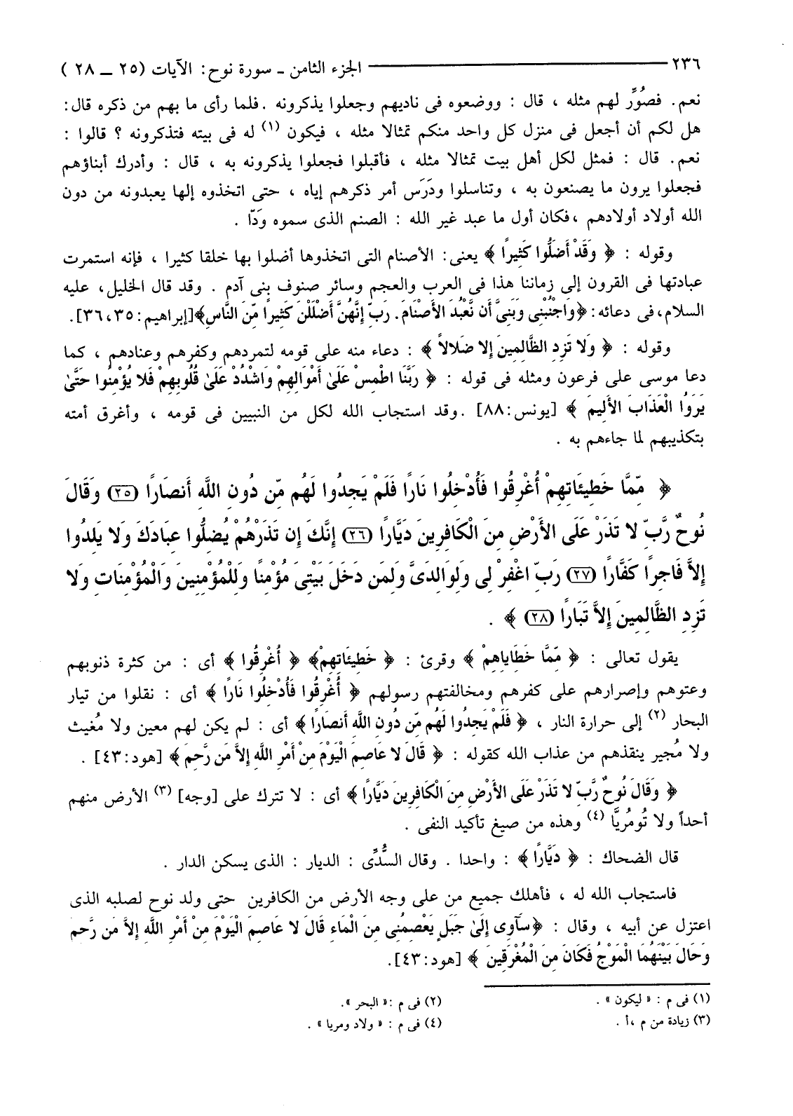 {مِمَّا خَطِيئَاتِهِمْ أُغْرِقُوا فَأُدْخِلُوا نَارًا فَلَمْ يَجِدُوا لَهُمْ مِنْ دُونِ اللَّهِ أَنْصَارًا (25) وَقَالَ نُوحٌ رَبِّ لَا تَذَرْ عَلَى الأرْضِ مِنَ الْكَافِرِينَ دَيَّارًا (26) إِنَّكَ إِنْ تَذَرْهُمْ يُضِلُّوا عِبَادَكَ وَلا يَلِدُوا إِلا فَاجِرًا كَفَّارًا (27) رَبِّ اغْفِرْ لِي وَلِوَالِدَيَّ وَلِمَنْ دَخَلَ بَيْتِيَ مُؤْمِنًا وَلِلْمُؤْمِنِينَ وَالْمُؤْمِنَاتِ وَلا تَزِدِ الظَّالِمِينَ إِلا تَبَارًا (28) }
