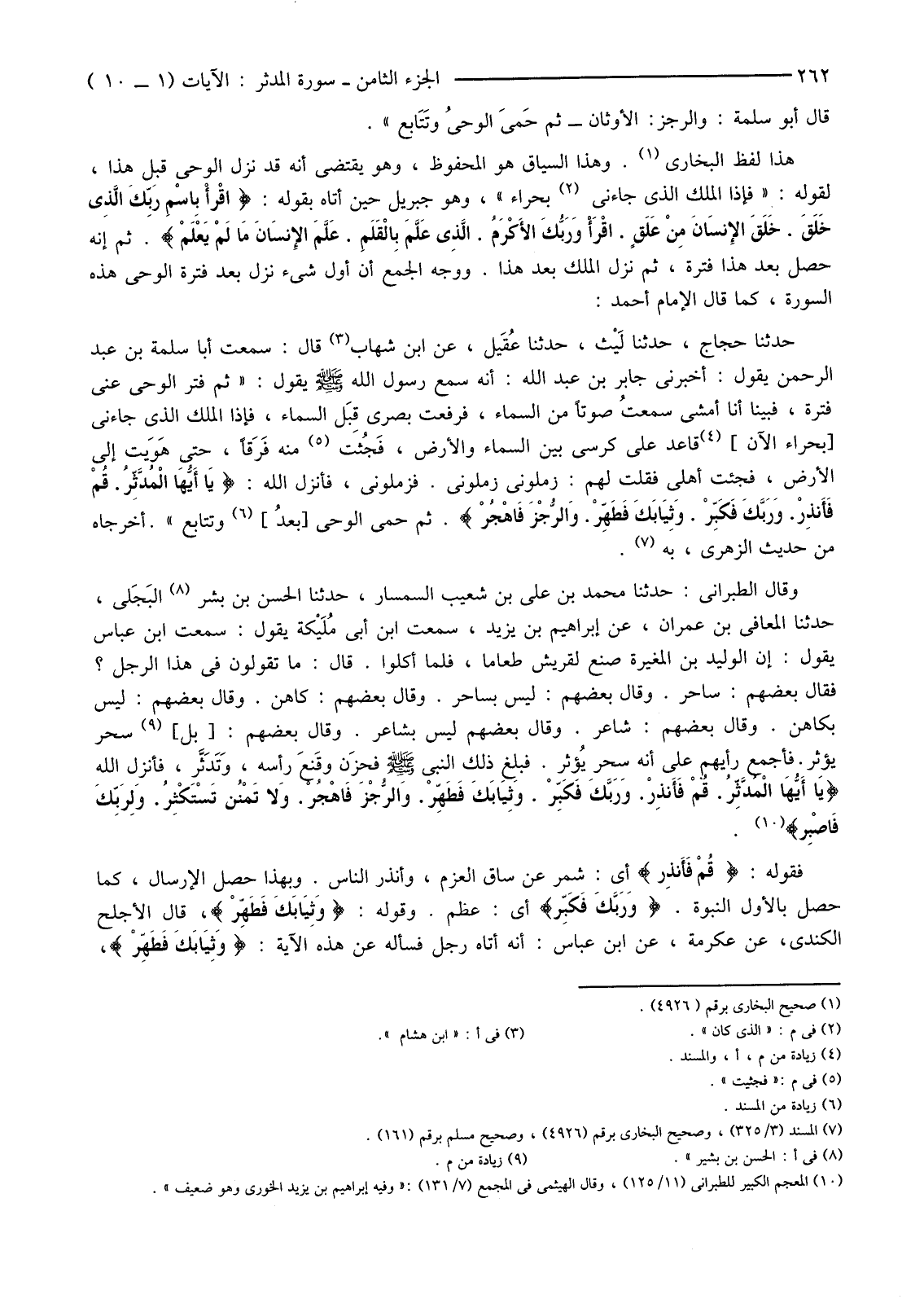 حَدَّثَنَا حَجَّاجٌ، حَدَّثَنَا لَيْث، حَدَّثَنَا عُقَيل، عَنِ ابْنِ شِهَابٍ (3) قَالَ: سَمِعْتُ أَبَا سَلَمَةَ بْنَ عَبْدِ الرَّحْمَنِ يَقُولُ: أَخْبَرَنِي جَابِرُ بْنُ عَبْدِ اللَّهِ: أَنَّهُ سَمِعَ رَسُولَ اللَّهِ صَلَّى اللَّهُ عَلَيْهِ وسلم يقول: "ثُمَّ فَتَرَ الْوَحْيُ عَنِّي فَتْرَةً، فَبَيْنَا أَنَا أَمْشِي سمعتُ صَوْتًا مِنَ السَّمَاءِ، فَرَفَعْتُ بَصَرِي قِبَل السَّمَاءِ، فَإِذَا الْمَلَكُ الَّذِي جَاءَنِي [بِحِرَاءٍ الْآنَ] (4) قَاعِدٌ عَلَى كُرْسِيٍّ بَيْنَ السَّمَاءِ وَالْأَرْضِ، فَجُثت (5) مِنْهُ فَرَقًا، حَتَّى هَوَيت إِلَى الْأَرْضِ، فَجِئْتُ أَهْلِي فَقُلْتُ لَهُمْ: زَمِّلُونِي زَمِّلُونِي. فَزَمَّلُونِي، فَأَنْزَلَ اللَّهُ: {يَا أَيُّهَا الْمُدَّثِّرُ قُمْ فَأَنْذِرْ وَرَبَّكَ فَكَبِّرْ وَثِيَابَكَ فَطَهِّرْ وَالرُّجْزَ فَاهْجُرْ} ثُمَّ حَمِيَ الْوَحْيُ [بعدُ] (6) وَتَتَابَعَ". أَخْرَجَاهُ مِنْ حَدِيثِ الزُّهْرِيِّ، بِهِ (7) .
