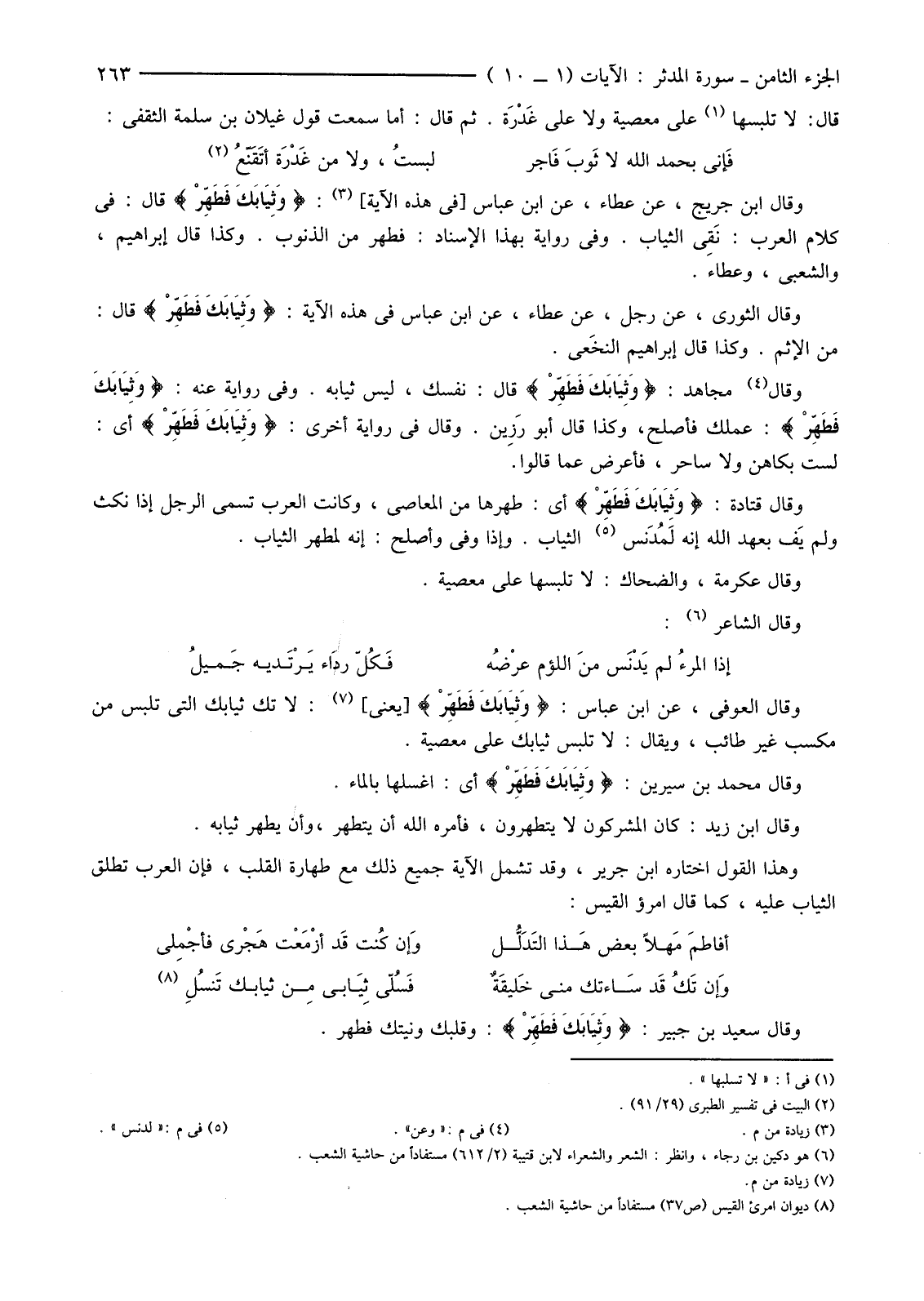 وَهَذَا الْقَوْلُ اخْتَارَهُ ابْنُ جَرِيرٍ، وَقَدْ تَشْمَلُ الْآيَةُ جَمِيعَ ذَلِكَ مَعَ طَهَارَةِ الْقَلْبِ، فَإِنَّ الْعَرَبَ تُطْلِقُ الثِّيَابَ عَلَيْهِ، كَمَا قَالَ امْرُؤُ الْقَيْسِ:
