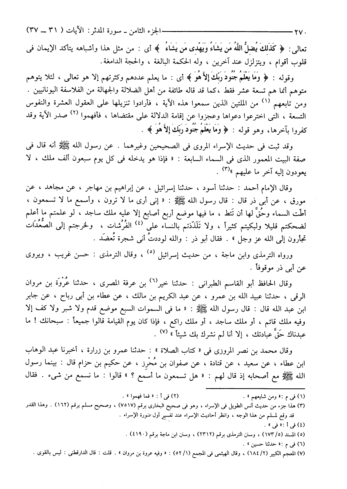 وَقَدْ ثَبَتَ فِي حَدِيثِ الْإِسْرَاءِ الْمَرْوِيِّ فِي الصَّحِيحَيْنِ وَغَيْرِهِمَا. عَنْ رَسُولِ اللَّهِ صَلَّى اللَّهُ عَلَيْهِ وَسَلَّمَ أَنَّهُ قَالَ فِي صِفَةِ الْبَيْتِ الْمَعْمُورِ الَّذِي فِي السَّمَاءِ السَّابِعَةِ: "فَإِذَا هُوَ يَدْخُلُهُ فِي كُلَّ يَوْمٍ سَبْعُونَ أَلْفَ مَلَكٍ، لَا يَعُودُونَ إِلَيْهِ آخِرَ مَا عَلَيْهِمْ" (3) .