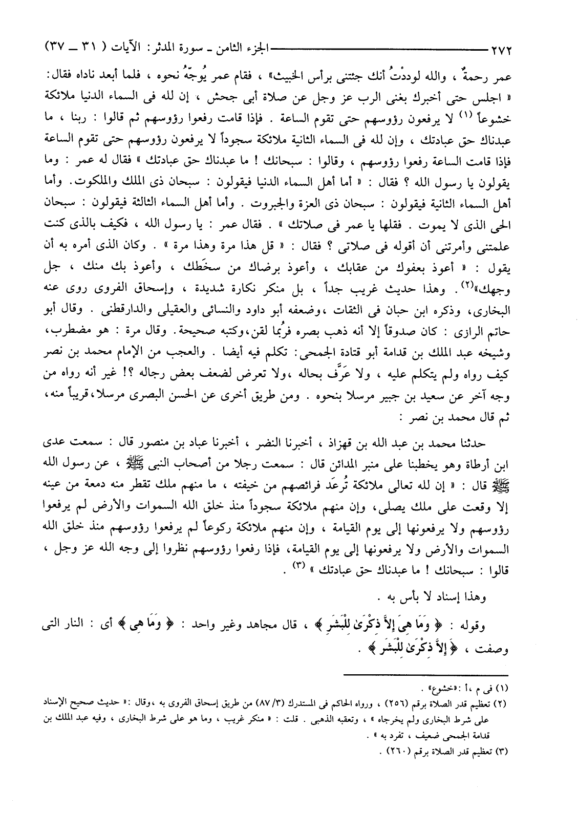 عُمَرَ رحمةٌ، وَاللَّهِ لوددْتُ أَنَّكَ جِئْتَنِي بِرَأْسِ الْخَبِيثِ"، فَقَامَ عُمَرُ يُوجّهُ نَحْوَهُ، فَلَمَّا أَبْعَدَ نَادَاهُ فَقَالَ: "اجْلِسْ حَتَّى أُخْبِرَكَ بِغِنَى الرَّبِّ عَزَّ وَجَلَّ عَنْ صَلَاةِ أَبِي جَحْشٍ، إِنَّ لِلَّهِ فِي السَّمَاءِ الدُّنْيَا مَلَائِكَةً خُشُوعًا (1) لَا يرفعون رءوسهم حتى تقوم الساعة. فإذا قامت رَفَعُوا رُءُوسَهُمْ ثُمَّ قَالُوا: رَبَّنَا، مَا عَبَدْنَاكَ حَقَّ عِبَادَتِكَ، وَإِنَّ لِلَّهِ فِي السَّمَاءِ الثَّانِيَةِ مَلَائِكَةً سُجُودًا لَا يَرْفَعُونَ رُءُوسَهُمْ حَتَّى تَقُومَ السَّاعَةُ فَإِذَا قَامَتِ السَّاعَةُ رَفَعُوا رُءُوسَهُمْ، وَقَالُوا: سُبْحَانَكَ! مَا عَبَدْنَاكَ حَقَّ عِبَادَتِكَ" فَقَالَ لَهُ عُمَرُ: وَمَا يَقُولُونَ يَا رَسُولَ اللَّهِ؟ فَقَالَ: " أَمَّا أَهْلُ السَّمَاءِ الدُّنْيَا فَيَقُولُونَ: سُبْحَانَ ذِي الْمُلْكِ وَالْمَلَكُوتِ. وَأَمَّا أَهْلُ السَّمَاءِ الثَّانِيَةِ فَيَقُولُونَ: سُبْحَانَ ذِي الْعِزَّةِ وَالْجَبَرُوتِ. وَأَمَّا أَهْلُ السَّمَاءِ الثَّالِثَةِ فَيَقُولُونَ: سُبْحَانَ الْحَيِّ الَّذِي لَا يَمُوتُ. فَقُلْهَا يَا عُمَرُ فِي صَلَاتِكَ". فَقَالَ عُمَرُ: يَا رَسُولَ اللَّهِ، فَكَيْفَ بِالَّذِي كُنْتَ عَلَّمْتَنِي وَأَمَرْتَنِي أَنْ أَقُولَهُ فِي صَلَاتِي؟ فَقَالَ: "قُلْ هَذَا مَرَّةً وَهَذَا مَرَّةً". وَكَانَ الَّذِي أَمَرَهُ بِهِ أَنْ يَقُولَ: "أَعُوذُ بِعَفْوِكَ مِنْ عِقَابِكَ، وَأَعُوذُ بِرِضَاكَ مِنْ سخَطك، وَأَعُوذُ بِكَ مِنْكَ، جَلَّ وَجْهُكَ" (2) وَهَذَا حَدِيثٌ غَرِيبٌ جِدًّا، بَلْ مُنْكَرٌ نَكَارَةً شَدِيدَةً، وَإِسْحَاقُ الْفَرَوِيُّ رَوَى عَنْهُ الْبُخَارِيُّ، وَذَكَرَهُ ابْنُ حِبَّانَ فِي الثِّقَاتِ، وَضَعَّفَهُ أَبُو دَاوُدَ وَالنَّسَائِيُّ وَالْعُقَيْلِيُّ وَالدَّارُقُطْنِيُّ. وَقَالَ أَبُو حَاتِمٍ الرَّازِيُّ: كَانَ صَدُوقًا إِلَّا أَنَّهُ ذَهَبَ بَصَرُهُ فرُبما لُقِّنَ، وَكُتُبُهُ صَحِيحَةٌ. وَقَالَ مَرَّةً: هُوَ مُضْطَرِبٌ، وَشَيْخُهُ عَبْدُ الْمَلِكِ بْنُ قُدَامَةَ أَبُو قَتَادَةَ الْجُمَحِيُّ: تُكَلِّمَ فِيهِ أَيْضًا. وَالْعَجَبُ مِنَ الْإِمَامِ مُحَمَّدِ بْنِ نَصْرٍ كَيْفَ رَوَاهُ وَلَمْ يَتَكَلَّمْ عَلَيْهِ، وَلَا عَرَّف بِحَالِهِ، وَلَا تَعَرَّضَ لِضَعْفِ بَعْضِ رِجَالِهِ؟! غَيْرَ أَنَّهُ رَوَاهُ مِنْ وَجْهٍ آخَرَ عَنْ سَعِيدِ بْنِ جُبَيْرٍ مُرْسَلًا بِنَحْوِهِ. وَمِنْ طَرِيقٍ أُخْرَى عَنِ الْحَسَنِ الْبَصْرِيِّ مُرْسَلًا قَرِيبًا مِنْهُ، ثُمَّ قَالَ مُحَمَّدُ بْنُ نَصْرٍ: