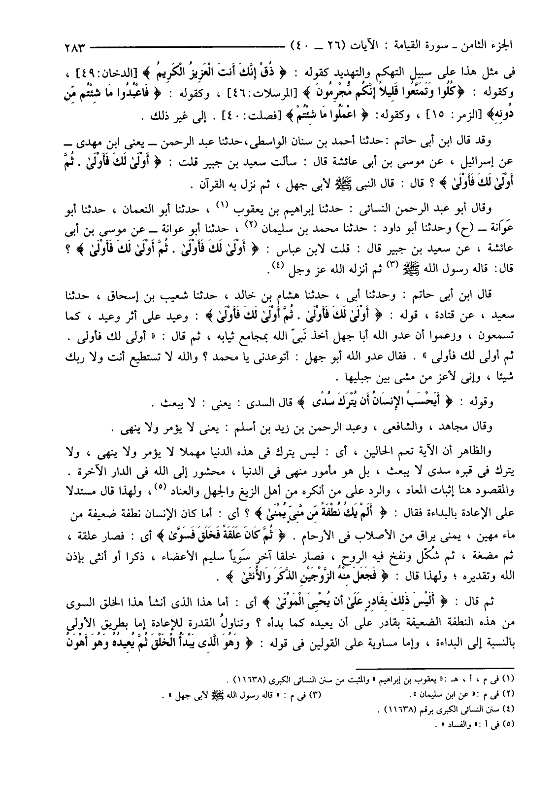 وَقَالَ أَبُو عَبْدِ الرَّحْمَنِ النَّسَائِيُّ: حَدَّثَنَا إِبْرَاهِيمُ بْنُ يَعْقُوبَ (1) . حَدَّثَنَا أَبُو النُّعْمَانِ، حَدَّثَنَا أَبُو عَوَانة - (ح) وَحَدَّثَنَا أَبُو دَاوُدَ: حَدَّثَنَا مُحَمَّدُ بْنُ سُلَيْمَانَ (2) . حَدَّثَنَا أَبُو عَوَانَةَ-عَنْ مُوسَى بْنِ أَبِي عَائِشَةَ، عَنْ سَعِيدِ بْنِ جُبَيْرٍ قَالَ: قُلْتُ لِابْنِ عَبَّاسٍ: {أَوْلَى لَكَ فَأَوْلَى ثُمَّ أَوْلَى لَكَ فَأَوْلَى} ؟ قَالَ: قَالَهُ رَسُولُ اللَّهِ صَلَّى اللَّهُ عَلَيْهِ وَسَلَّمَ (3) ثُمَّ أَنْزَلَهُ اللَّهِ عَزَّ وَجَلَّ (4) .
