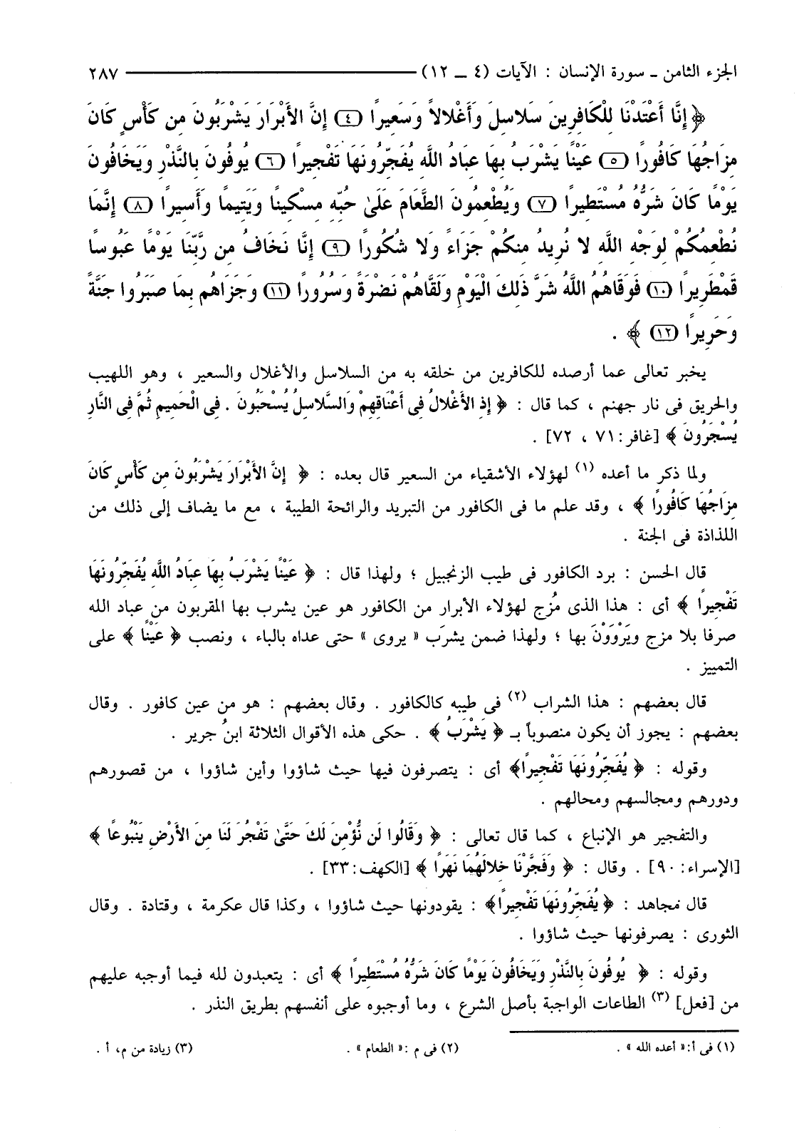 وَلَمَّا ذَكَرَ مَا أَعَدَّهُ (1) لِهَؤُلَاءِ الْأَشْقِيَاءِ مِنَ السَّعِيرِ قَالَ بَعْدَهُ: {إِنَّ الأبْرَارَ يَشْرَبُونَ مِنْ كَأْسٍ كَانَ مِزَاجُهَا كَافُورًا} وَقَدْ عُلِمَ مَا فِي الْكَافُورِ مِنَ التَّبْرِيدِ وَالرَّائِحَةِ الطَّيِّبَةِ، مَعَ مَا يُضَافُ إِلَى ذَلِكَ مِنَ اللَّذَاذَةِ فِي الْجَنَّةِ.