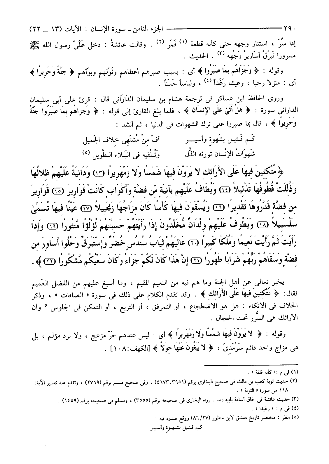 وَرَوَى الْحَافِظُ ابْنُ عَسَاكِرَ فِي تَرْجَمَةِ هِشَامِ بْنِ سُلَيْمَانَ الدّارَاني قَالَ: قُرِئَ عَلَى أَبِي سُلَيْمَانَ الدَّارَانِيِّ سُورَةُ: {هَلْ أَتَى عَلَى الإنْسَانِ} فَلَمَّا بَلَغَ الْقَارِئُ إِلَى قَوْلِهِ: {وَجَزَاهُمْ بِمَا صَبَرُوا جَنَّةً وَحَرِيرًا} قَالَ بِمَا صَبَرُوا عَلَى تَرْكِ الشَّهَوَاتِ فِي الدُّنْيَا، ثُمَّ أَنْشَدَ: