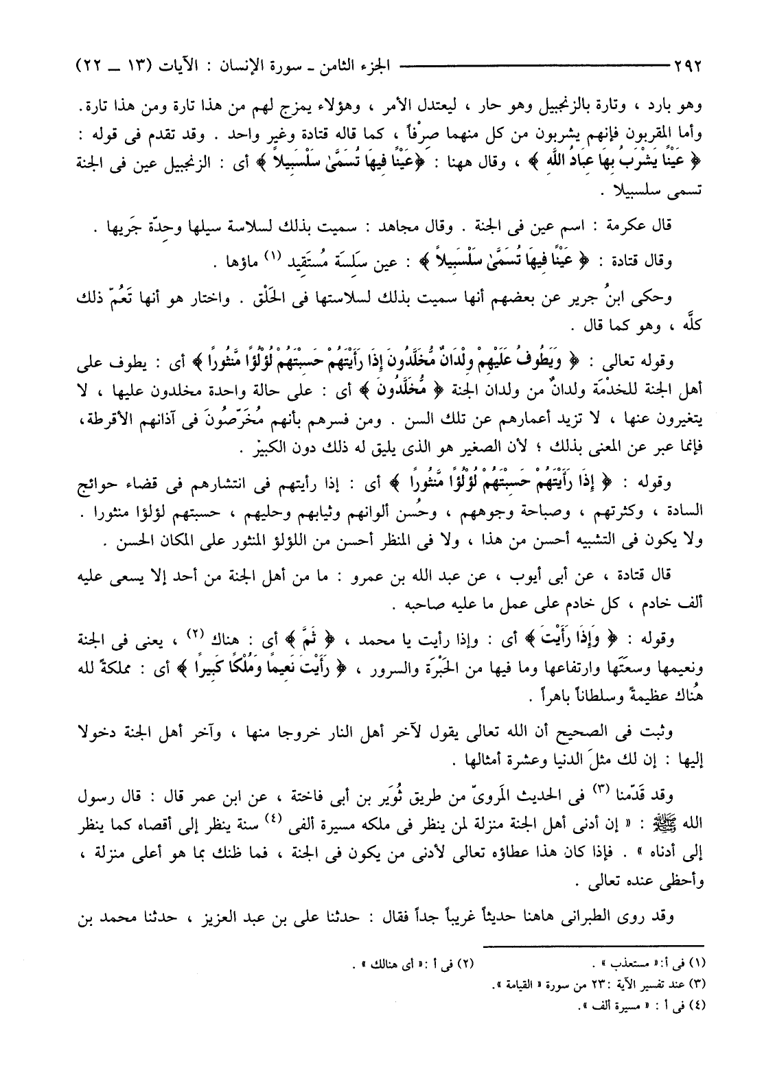 وَهُوَ بَارِدٌ، وَتَارَةً بِالزَّنْجَبِيلِ وَهُوَ حَارٌّ، لِيَعْتَدِلَ الْأَمْرُ، وَهَؤُلَاءِ يُمْزَجُ لَهُمْ مِنْ هَذَا تَارَةً وَمِنْ هَذَا تَارَةً. وَأَمَّا الْمُقَرَّبُونَ فَإِنَّهُمْ يَشْرَبُونَ مِنْ كُلٍّ مِنْهُمَا صِرْفًا، كَمَا قَالَهُ قَتَادَةُ وَغَيْرُ وَاحِدٍ. وَقَدْ تَقَدَّمَ قَوْلُهُ: {عَيْنًا يَشْرَبُ بِهَا عِبَادُ اللَّهِ} وَقَالَ هَاهُنَا: {عَيْنًا فِيهَا تُسَمَّى سَلْسَبِيلا} أَيِ: الزَّنْجَبِيلُ عَيْنٌ فِي الْجَنَّةِ تُسَمَّى سَلْسَبِيلًا.