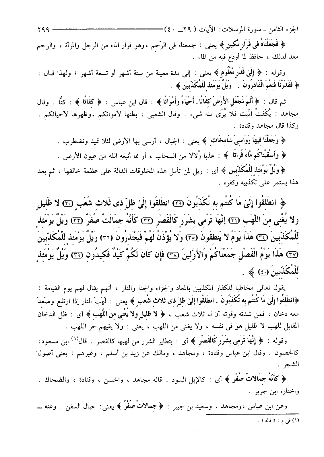 {انْطَلِقُوا إِلَى مَا كُنْتُمْ بِهِ تُكَذِّبُونَ (29) انْطَلِقُوا إِلَى ظِلٍّ ذِي ثَلاثِ شُعَبٍ (30) لَا ظَلِيلٍ وَلا يُغْنِي مِنَ اللَّهَبِ (31) إِنَّهَا تَرْمِي بِشَرَرٍ كَالْقَصْرِ (32) كَأَنَّهُ جِمَالَةٌ صُفْرٌ (33) وَيْلٌ يَوْمَئِذٍ لِلْمُكَذِّبِينَ (34) هَذَا يَوْمُ لَا يَنْطِقُونَ (35) وَلا يُؤْذَنُ لَهُمْ فَيَعْتَذِرُونَ (36) وَيْلٌ يَوْمَئِذٍ لِلْمُكَذِّبِينَ (37) هَذَا يَوْمُ الْفَصْلِ جَمَعْنَاكُمْ وَالأوَّلِينَ (38) فَإِنْ كَانَ لَكُمْ كَيْدٌ فَكِيدُونِ (39) وَيْلٌ يَوْمَئِذٍ لِلْمُكَذِّبِينَ (40) }