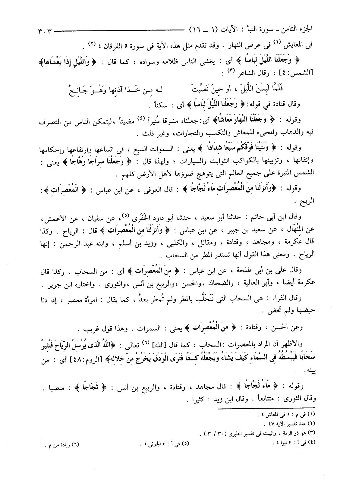 وَقَوْلُهُ: {وَأَنزلْنَا مِنَ الْمُعْصِرَاتِ مَاءً ثَجَّاجًا} قَالَ الْعَوْفِيُّ، عَنِ ابْنِ عَبَّاسٍ: {الْمُعْصِرَاتِ} الرِّيحُ.