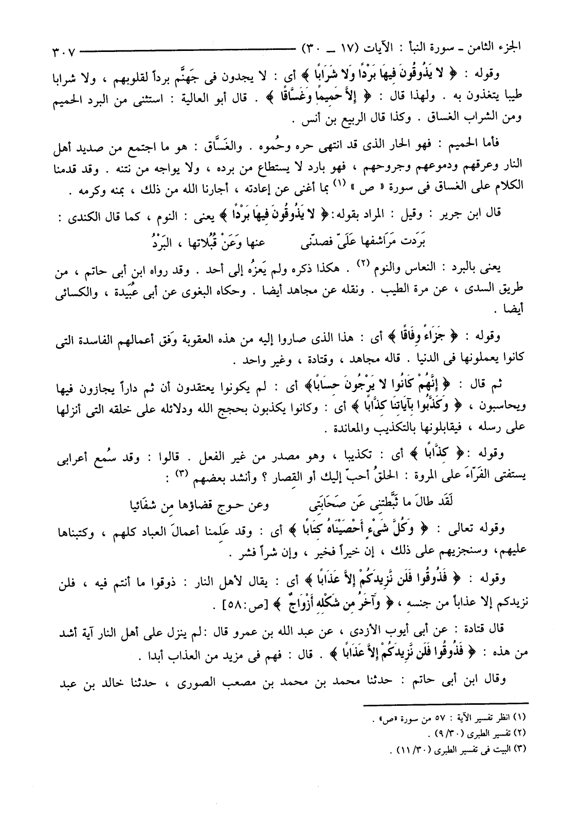 وَقَوْلُهُ: {لَا يَذُوقُونَ فِيهَا بَرْدًا وَلا شَرَابًا} أَيْ: لَا يَجِدُونَ فِي جَهنَّم بَرْدًا لِقُلُوبِهِمْ، وَلَا شَرَابًا طَيِّبًا يَتَغَذَّوْنَ بِهِ. وَلِهَذَا قَالَ: {إِلا حَمِيمًا وَغَسَّاقًا} قَالَ أَبُو الْعَالِيَةِ: اسْتَثْنَى مِنَ الْبَرْدِ الْحَمِيمَ وَمِنَ الشَّرَابِ الْغَسَاقَ. وَكَذَا قَالَ الرَّبِيعُ بْنُ أَنَسٍ. فَأَمَّا الْحَمِيمُ: فَهُوَ الْحَارُّ الَّذِي قَدِ انْتَهَى حَرُّهُ وحُموه. والغَسَّاق: هُوَ مَا اجْتَمَعَ مِنْ صَدِيدِ أَهْلِ النَّارِ وَعَرَقِهِمْ وَدُمُوعِهِمْ وَجُرُوحِهِمْ، فَهُوَ بَارِدٌ لَا يُسْتَطَاعُ مِنْ بَرْدِهِ، وَلَا يُوَاجَهُ مَنْ نَتَنِهِ. وَقَدْ قَدَّمْنَا الْكَلَامَ عَلَى الْغَسَّاقِ فِي سُورَةِ "ص" (1) بِمَا أَغْنَى عَنْ إِعَادَتِهِ، أَجَارَنَا اللَّهُ مِنْ ذَلِكَ، بِمَنِّهِ وَكَرَمِهِ.