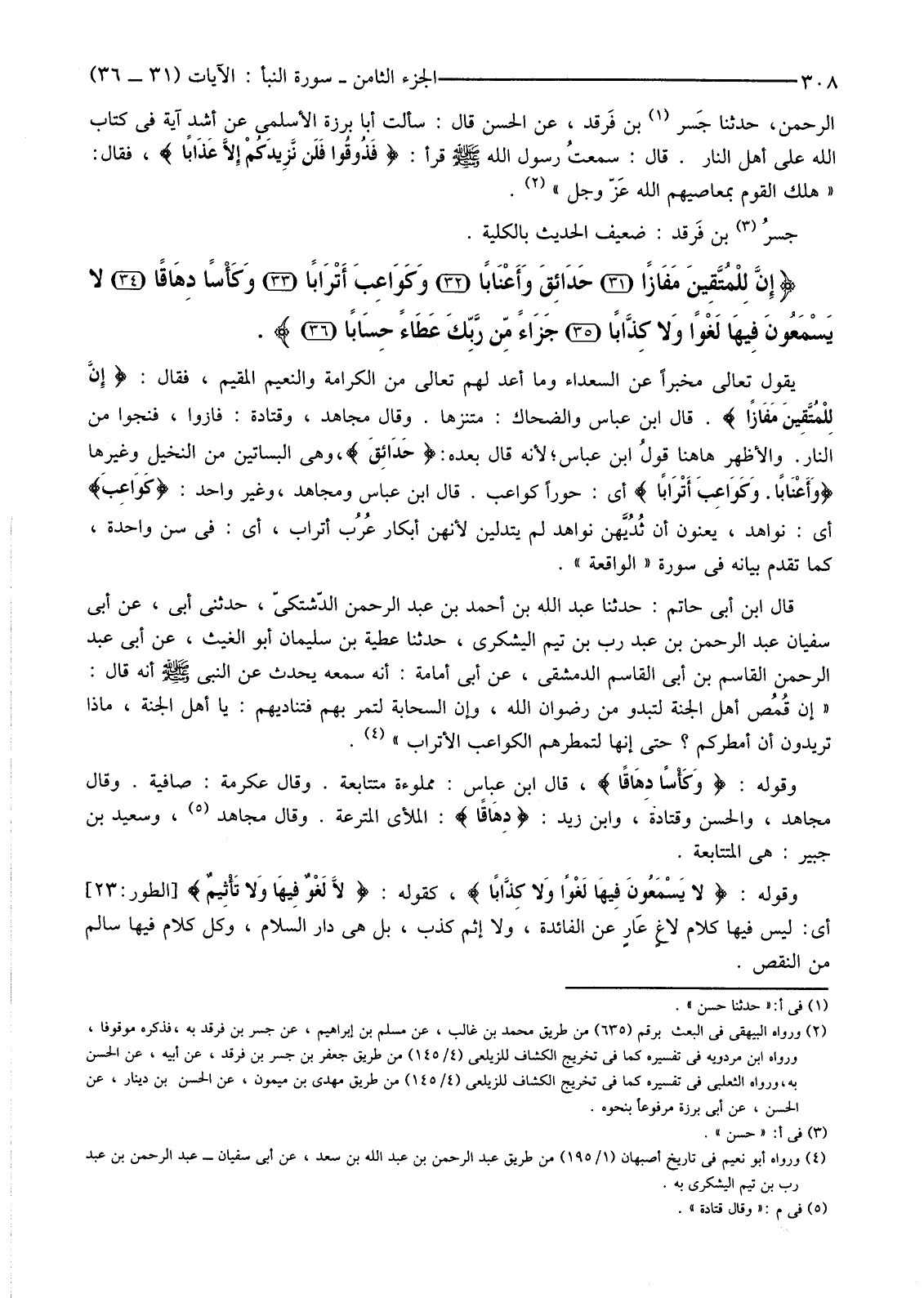 {إِنَّ لِلْمُتَّقِينَ مَفَازًا (31) حَدَائِقَ وَأَعْنَابًا (32) وَكَوَاعِبَ أَتْرَابًا (33) وَكَأْسًا دِهَاقًا (34) لَا يَسْمَعُونَ فِيهَا لَغْوًا وَلا كِذَّابًا (35) جَزَاءً مِنْ رَبِّكَ عَطَاءً حِسَابًا (36) }