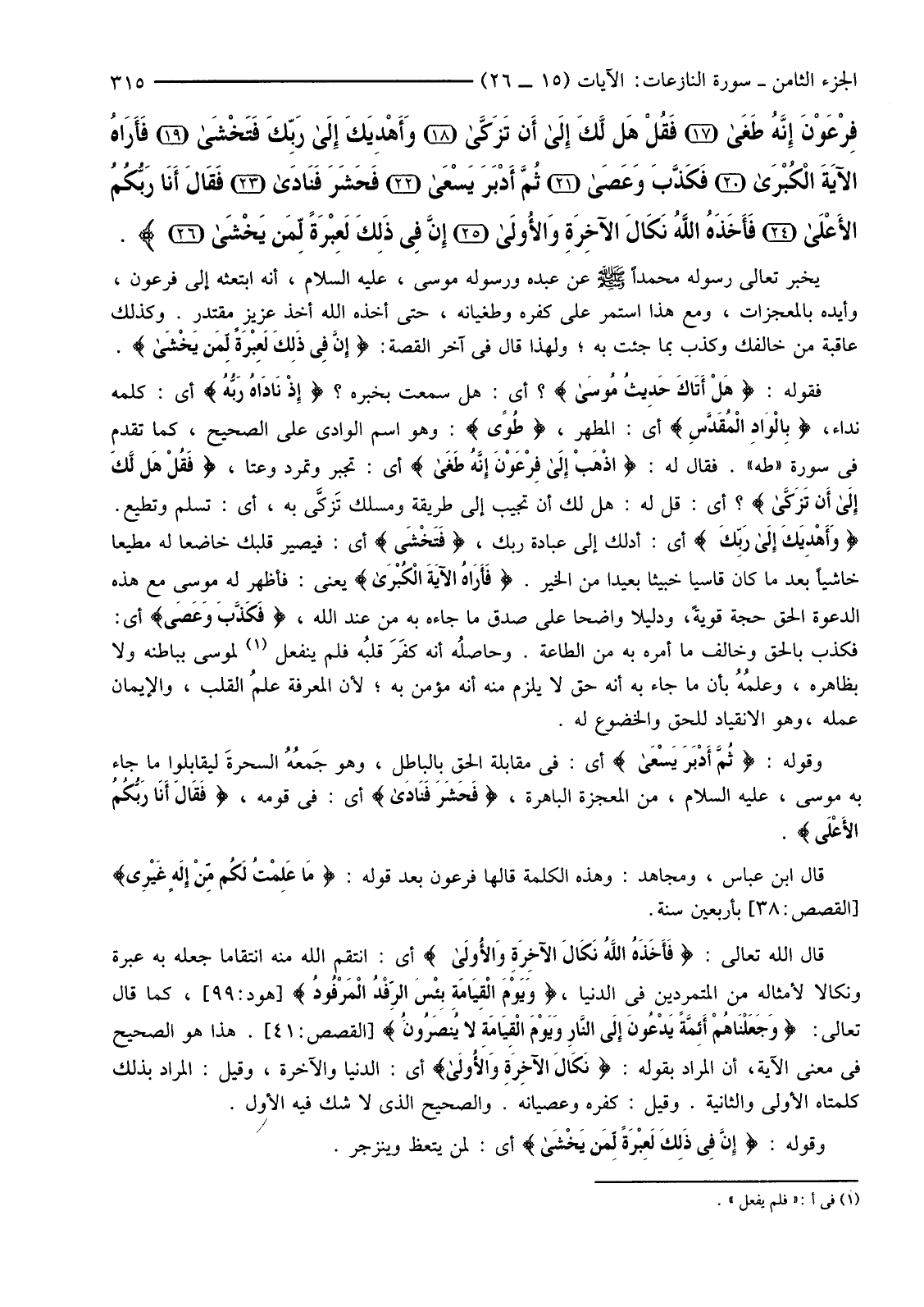 فَقَوْلُهُ: {هَلْ أتَاكَ حَدِيثُ مُوسَى} ؟ أَيْ: هَلْ سَمِعْتَ بِخَبَرِهِ؟ {إِذْ نَادَاهُ رَبُّهُ} أَيْ: كَلَّمَهُ نِدَاءٍ، {بِالْوَادِي الْمُقَدَّسِ} أَيِ: الْمُطَهَّرِ، {طُوًى} وَهُوَ اسْمُ الْوَادِي عَلَى الصَّحِيحِ، كَمَا تَقَدَّمَ فِي سُورَةِ طه. فَقَالَ لَهُ: {اذْهَبْ إِلَى فِرْعَوْنَ إِنَّهُ طَغَى} أَيْ: تَجَبَّرَ وَتَمَرَّدَ وَعَتَا، {فَقُلْ هَلْ لَكَ إِلَى أَنْ تَزَكَّى} ؟ أَيْ: قُلْ لَهُ هَلْ لَكَ أَنْ تُجِيبَ إِلَى طَرِيقَةٍ وَمَسْلَكٍ تَزكَّى بِهِ، أَيْ: تُسَلِّمُ وَتُطِيعُ. {وَأَهْدِيَكَ إِلَى رَبِّكَ} أَيْ: أَدُلُّكَ إِلَى عِبَادَةِ رَبِّكَ، {فَتَخْشَى} أَيْ: فَيَصِيرُ قَلْبُكَ خَاضِعًا لَهُ مُطِيعًا خَاشِيًا بَعْدَمَا كَانَ قَاسِيًا خَبِيثًا بَعِيدًا مِنَ الْخَيْرِ. {فَأَرَاهُ الآيَةَ الْكُبْرَى} يَعْنِي: فَأَظْهَرَ لَهُ مُوسَى مَعَ هَذِهِ الدَّعْوَةِ الْحَقِّ حُجَّةً قَوِيَّةً، وَدَلِيلًا وَاضِحًا عَلَى صِدْقِ مَا جَاءَهُ بِهِ مِنْ عِنْدِ اللَّهِ، {فَكَذَّبَ وَعَصَى} أَيْ: فَكَذَّبَ بِالْحَقِّ وَخَالَفَ مَا أَمَرَهُ بِهِ مِنَ الطَّاعَةِ. وحاصلُه أَنَّهُ كَفَر قلبُه فَلَمْ يَنْفَعِلْ (1) لِمُوسَى بِبَاطِنِهِ وَلَا بِظَاهِرِهِ، وعلمُهُ بِأَنَّ مَا جَاءَ بِهِ أَنَّهُ حَقٌّ لَا يُلْزِمُ مِنْهُ أَنَّهُ مُؤْمِنٌ بِهِ؛ لِأَنَّ الْمَعْرِفَةَ علمُ الْقَلْبِ، وَالْإِيمَانُ عَمَلُهُ، وَهُوَ الِانْقِيَادُ لِلْحَقِّ وَالْخُضُوعِ لَهُ.