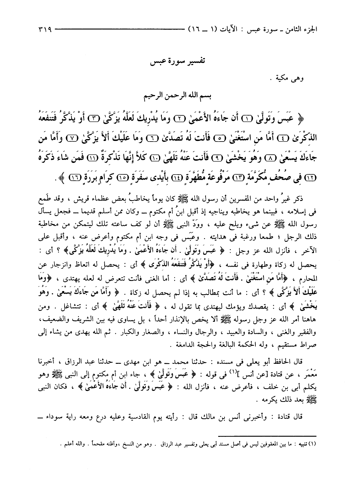 {عَبَسَ وَتَوَلَّى (1) أَنْ جَاءَهُ الأَعْمَى (2) وَمَا يُدْرِيكَ لَعَلَّهُ يَزَّكَّى (3) أَوْ يَذَّكَّرُ فَتَنْفَعَهُ الذِّكْرَى (4) أَمَّا مَنِ اسْتَغْنَى (5) فَأَنْتَ لَهُ تَصَدَّى (6) وَمَا عَلَيْكَ أَلا يَزَّكَّى (7) وَأَمَّا مَنْ جَاءَكَ يَسْعَى (8) وَهُوَ يَخْشَى (9) فَأَنْتَ عَنْهُ تَلَهَّى (10) كَلا إِنَّهَا تَذْكِرَةٌ (11) فَمَنْ شَاءَ ذَكَرَهُ (12) فِي صُحُفٍ مُكَرَّمَةٍ (13) مَرْفُوعَةٍ مُطَهَّرَةٍ (14) بِأَيْدِي سَفَرَةٍ (15) كِرَامٍ بَرَرَةٍ (16) }