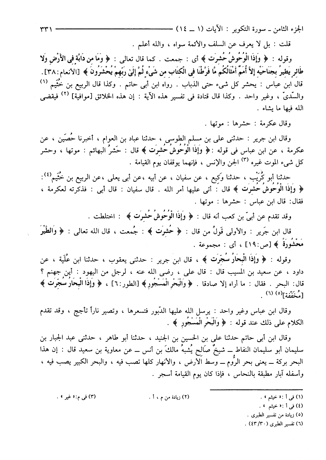 قَالَ ابْنُ جَرِيرٍ: وَالْأُولَى قَولُ مَنْ قَالَ: {حُشِرَت} جُمعت، قَالَ اللَّهُ تَعَالَى: {وَالطَّيْرَ مَحْشُورَةً} [ص: 19] ، أَيْ: مَجْمُوعَةً.