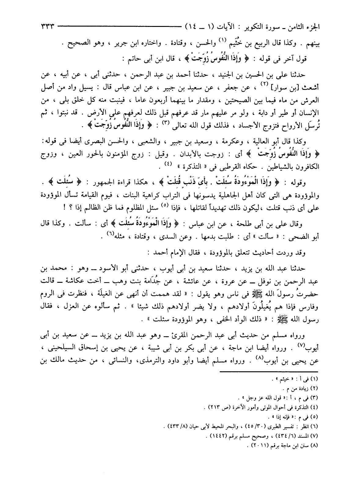 وَقَوْلُهُ: {وَإِذَا الْمَوْءُودَةُ سُئِلَتْ بِأَيِّ ذَنْبٍ قُتِلَتْ} هَكَذَا قِرَاءَةُ الْجُمْهُورِ: {سُئلَت} وَالْمَوْءُودَةُ هِيَ الَّتِي كَانَ أَهْلُ الْجَاهِلِيَّةِ يَدُسُّونَهَا فِي التُّرَابِ كَرَاهِيَةَ الْبَنَاتِ، فَيَوْمَ الْقِيَامَةِ تُسْأَلُ الْمَوْءُودَةُ عَلَى أَيِّ ذَنْبٍ قُتِلَتْ، لِيَكُونَ ذَلِكَ تَهْدِيدًا لِقَاتِلِهَا، فَإِذَا (5) سُئِلَ الْمَظْلُومُ فَمَا ظَنُّ الظَّالِمِ إِذًا؟!