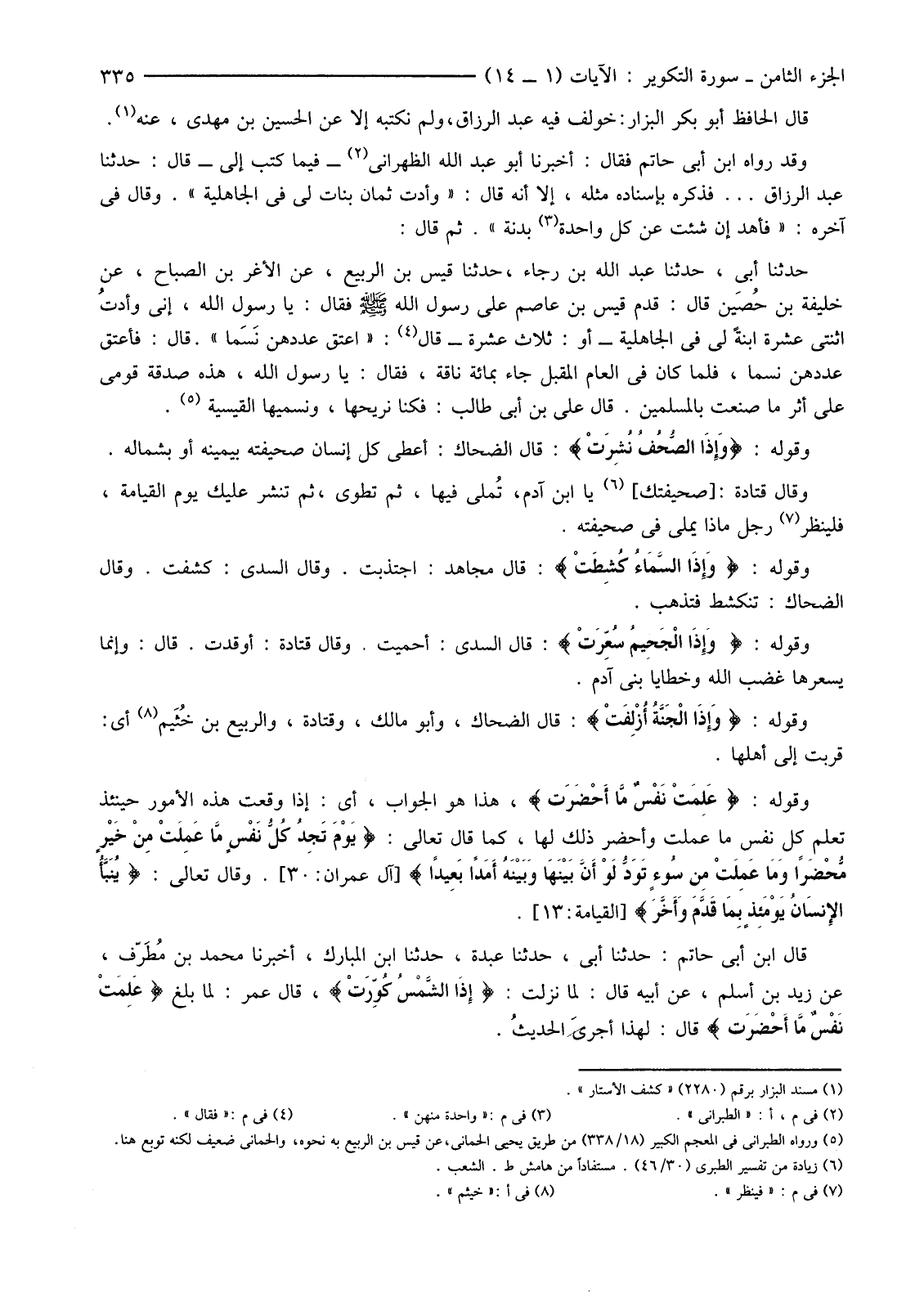 قَالَ ابْنُ أَبِي حَاتِمٍ: حَدَّثَنَا أَبِي، حَدَّثَنَا عَبْدَةُ، حَدَّثَنَا ابْنُ الْمُبَارَكِ، أَخْبَرَنَا مُحَمَّدُ بْنُ مُطَرّف، عَنْ زَيْدِ بْنِ أَسْلَمَ، عَنْ أَبِيهِ قَالَ: لَمَّا نَزَلَتْ: {إِذَا الشَّمْسُ كُوِّرَتْ} قَالَ عُمَرُ: لَمَّا بَلَغَ {عَلِمَتْ نَفْسٌ مَا أَحْضَرَتْ} قال: لهذا أجرىَ الحديثُ.