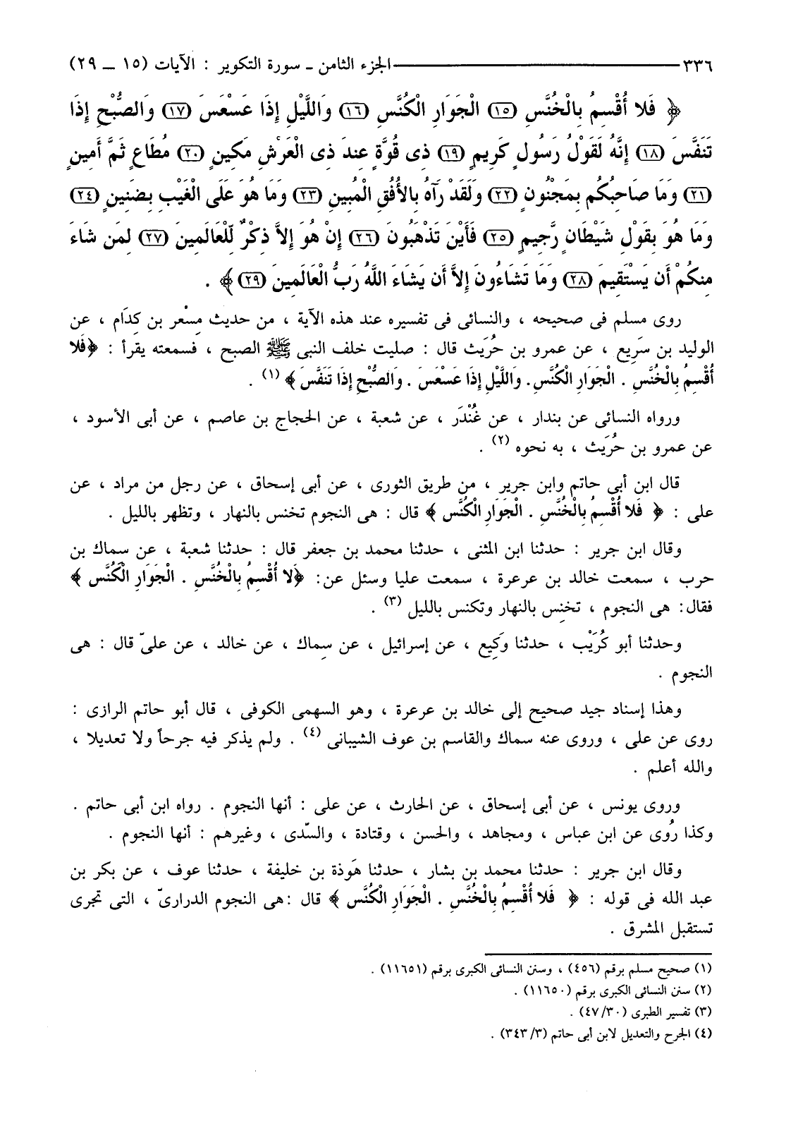رَوَى مُسْلِمٌ فِي صَحِيحِهِ، وَالنَّسَائِيُّ فِي تَفْسِيرِهِ عِنْدَ هَذِهِ الْآيَةِ، مِنْ حَدِيثِ مِسْعر بْنِ كِدَام، عَنِ الْوَلِيدِ بْنِ سَرِيع، عَنْ عَمْرِو بْنِ حُرَيث قَالَ: صَلَّيْتُ خَلْفَ النَّبِيِّ صَلَّى اللَّهُ عَلَيْهِ وَسَلَّمَ الصُّبْحَ، فَسَمِعْتُهُ يَقْرَأُ: {فَلا أُقْسِمُ بِالْخُنَّسِ الْجَوَارِي الْكُنَّسِ وَاللَّيْلِ إِذَا عَسْعَسَ وَالصُّبْحِ إِذَا تَنَفَّسَ} (1) .