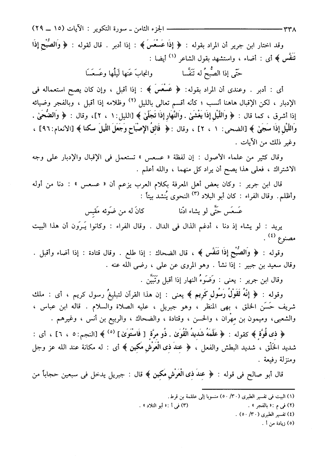وَقَدِ اخْتَارَ ابْنُ جَرِيرٍ أَنَّ الْمُرَادَ بِقَوْلِهِ: {إِذَا عَسْعَسَ} إِذَا أَدْبَرَ. قَالَ لِقَوْلِهِ: {وَالصُّبْحِ إِذَا تَنَفَّسَ} أَيْ: أَضَاءَ، وَاسْتَشْهَدَ بِقَوْلِ الشَّاعِرِ (1) أَيْضًا: