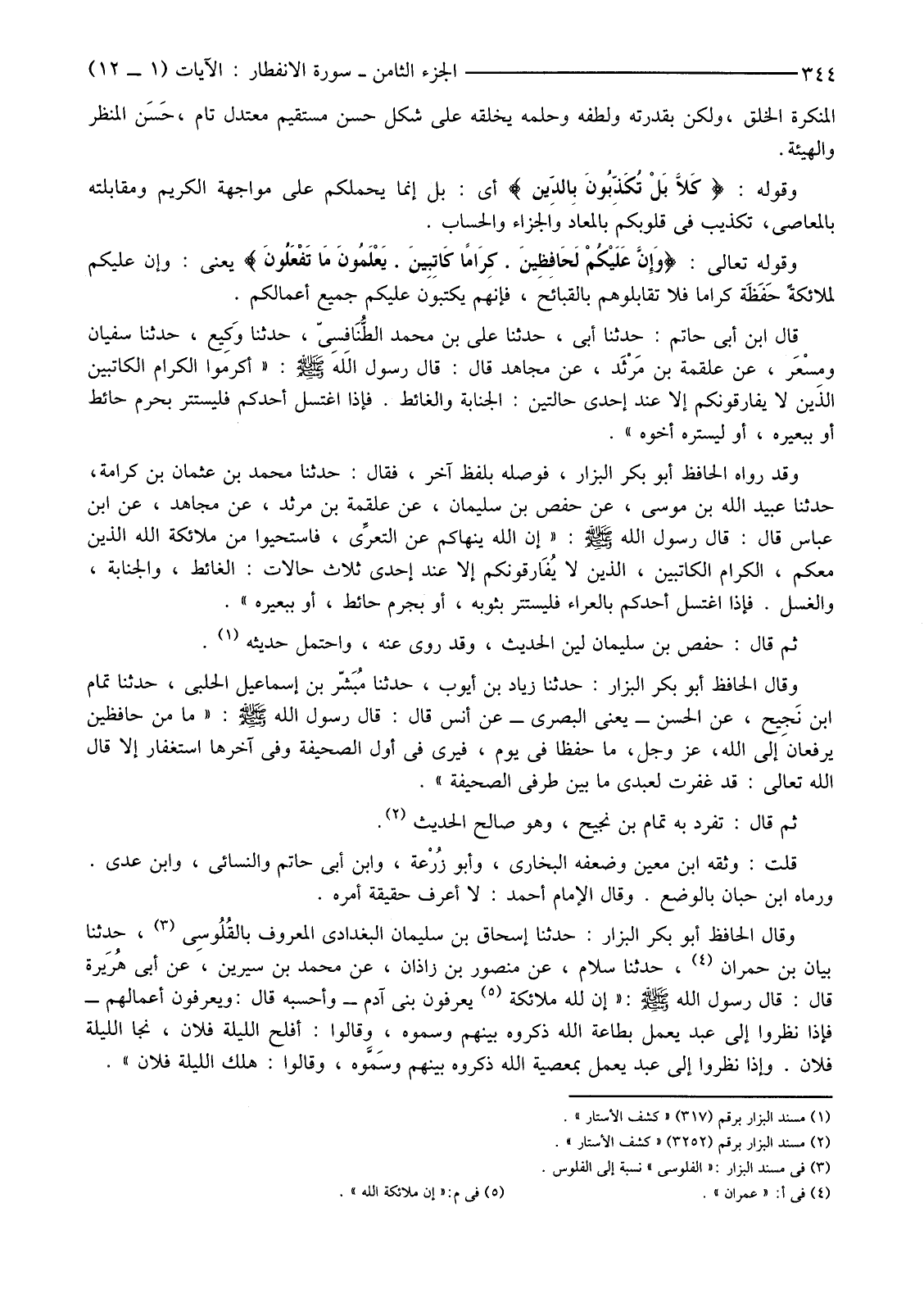 وَقَالَ الْحَافِظُ أَبُو بَكْرٍ الْبَزَّارُ: حَدَّثَنَا إِسْحَاقُ بْنُ سُلَيْمَانَ الْبَغْدَادِيُّ الْمَعْرُوفُ بالقُلُوسِي (3) حَدَّثَنَا بَيَانُ بْنُ حِمْرَانَ (4) حَدَّثَنَا سَلَامٌ، عَنْ مَنْصُورِ بْنِ زَاذَانَ، عَنْ مُحَمَّدِ بْنِ سِيرِينَ، عَنْ أَبِي هُرَيرة قَالَ: قَالَ رَسُولُ اللَّهِ صَلَّى اللَّهُ عَلَيْهِ وَسَلَّمَ: "إِنَّ لِلَّهِ مَلَائِكَةً (5) يَعْرِفُونَ بَنِي آدَمَ-وَأَحْسَبُهُ قَالَ: وَيَعْرِفُونَ أَعْمَالَهُمْ-فَإِذَا نَظَرُوا إِلَى عَبْدٍ يَعْمَلُ بِطَاعَةِ اللَّهِ ذَكَرُوهُ بَيْنَهُمْ وسَمَّوه، وَقَالُوا: أَفْلَحَ اللَّيْلَةَ فُلَانٌ، نَجَا اللَّيْلَةَ فُلَانٌ. وَإِذَا نَظَرُوا إِلَى عَبْدٍ يَعْمَلُ بِمَعْصِيَةِ اللَّهِ وَذَكَرُوهُ بَيْنَهُمْ وَسَمَّوْهُ، وقالوا:هلك الليلة فلان".