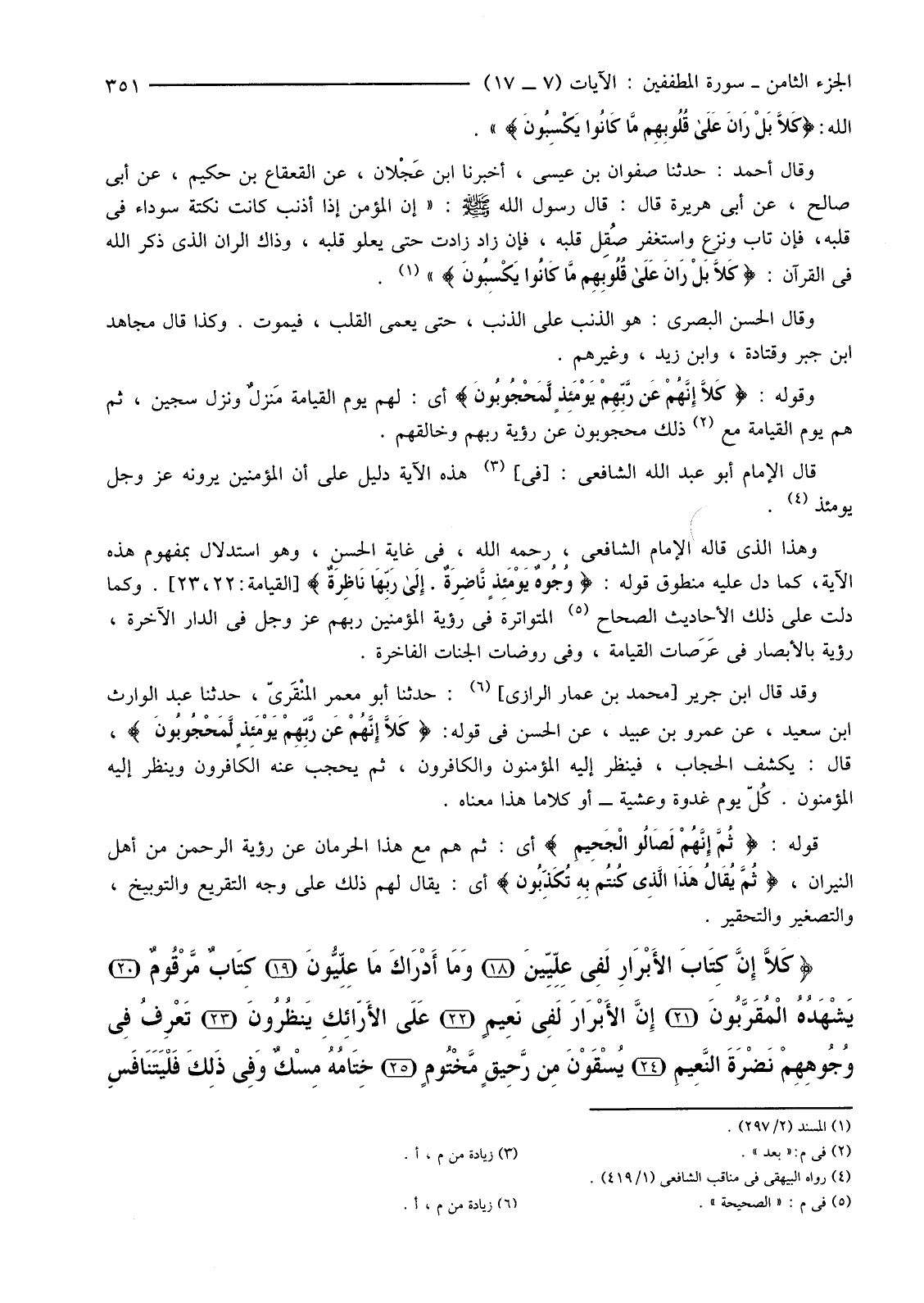 وَهَذَا الَّذِي قَالَهُ الْإِمَامُ الشَّافِعِيُّ، رَحِمَهُ اللَّهُ، فِي غَايَةِ الْحُسْنِ، وَهُوَ اسْتِدْلَالٌ بِمَفْهُومِ هَذِهِ الْآيَةِ، كَمَا دَلَّ عَلَيْهِ مَنْطُوقُ قَوْلِهِ: {وُجُوهٌ يَوْمَئِذٍ نَاضِرَةٌ إِلَى رَبِّهَا نَاظِرَةٌ} [الْقِيَامَةِ: 22، 23] . وَكَمَا دَلَّتْ عَلَى ذَلِكَ الْأَحَادِيثُ الصِّحَاحُ (5) الْمُتَوَاتِرَةُ فِي رُؤْيَةِ الْمُؤْمِنِينَ رَبَّهُمْ عَزَّ وَجَلَّ فِي الدَّارِ الْآخِرَةِ، رُؤْيَةٌ بِالْأَبْصَارِ فِي عَرَصات الْقِيَامَةِ، وَفِي رَوْضَاتِ الْجِنَانِ الْفَاخِرَةِ.