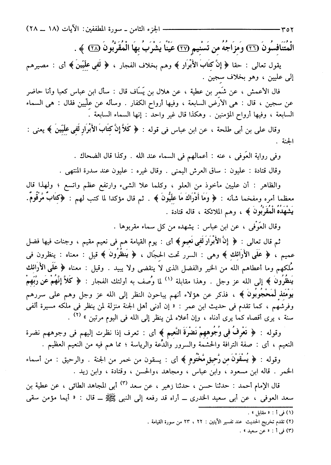 وَالظَّاهِرُ: أَنَّ عِلِّيِّينَ مَأْخُوذٌ مِنَ الْعُلُوِّ، وَكُلَّمَا عَلَا الشَّيْءُ وَارْتَفَعَ عَظُمَ وَاتَّسَعَ؛ وَلِهَذَا قَالَ مُعَظِّمًا أَمْرَهُ وَمُفَخِّمًا شَأْنَهُ: {وَمَا أَدْرَاكَ مَا عِلِّيُّون} ثُمَّ قَالَ مُؤَكِّدًا لِمَا كَتَبَ لَهُمْ: {كِتَابٌ مَرْقُومٌ يَشْهَدُهُ الْمُقَرَّبُونَ} وَهُمُ الْمَلَائِكَةُ، قَالَهُ قَتَادَةُ.