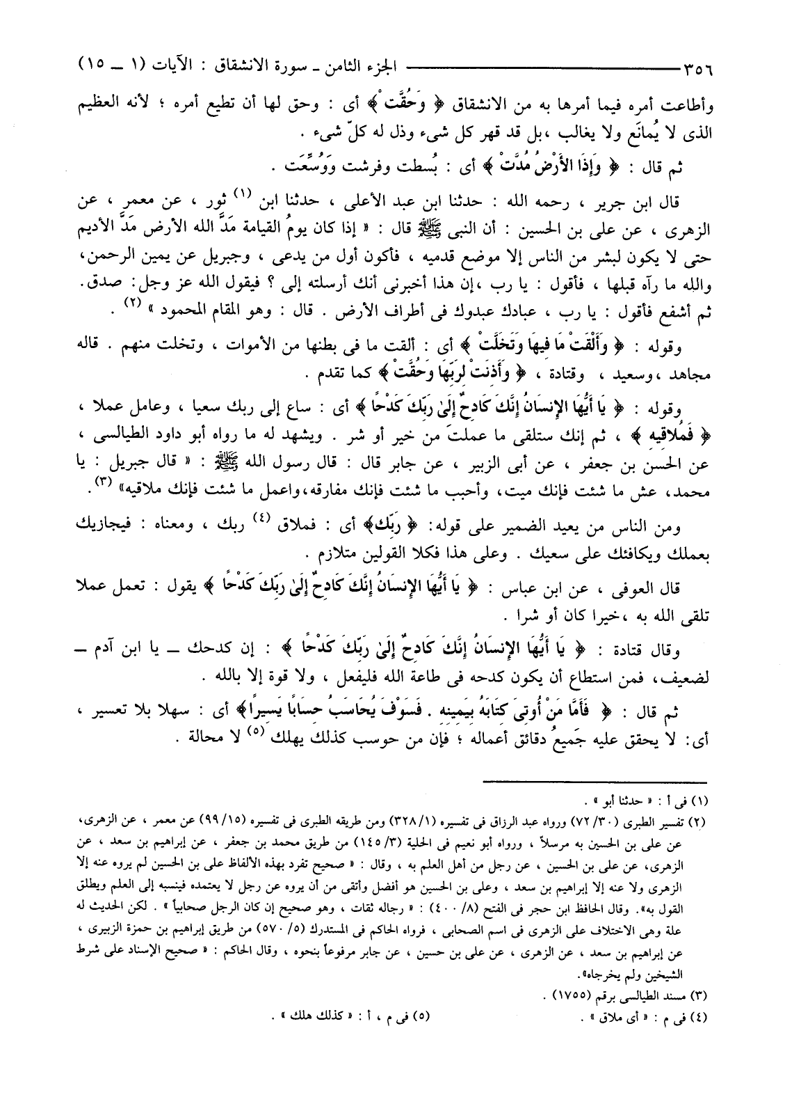 (2) تفسير الطبري (30/72) ورواه عبد الرزاق في تفسيره (1/328) ومن طريقه الطبري في تفسيره (15/99) عَنْ مَعْمَرٌ، عَنِ الزُّهْرِيِّ، عَنْ عَلِيِّ بْنِ الْحُسَيْنِ به مرسلا، ورواه أبو نعيم في الحلية (3/145) من طريق محمد بن جعفر، عَنْ إِبْرَاهِيمَ بْنِ سَعْدٍ، عَنِ الزُّهْرِيِّ، عَنْ عَلِيِّ بْنِ الْحُسَيْنِ، عَنِ رجل من أهل العلم به، وقال: "صحيح تفرد بهذه الألفاظ علي بن الحسين لم يروه عنه إلا الزهري ولا عنه إلا إبراهيم بن سعد، وعلي بن الحسين هو أفضل وأتقى من أن يروه عن رجل لا يعتمده فينسبه إلى العلم ويطلق القول به". وقال الحافظ ابن حجر في الفتح (8/400) : "رجاله ثقات، وهو صحيح إن كان الرجل صحابيا". لكن الحديث له علة وهي الاختلاف على الزهري في اسم الصحابي، فرواه الحاكم في المستدرك (5/570) من طريق إبراهيم بن حمزة الزبيري، عَنْ إِبْرَاهِيمَ بْنِ سَعْدٍ، عَنِ الزُّهْرِيِّ، عَنْ علي بن حسين، عن جابر مرفوعا بنحوه، وقال الحاكم: "صحيح الإسناد على شرط الشيخين ولم يخرجاه".