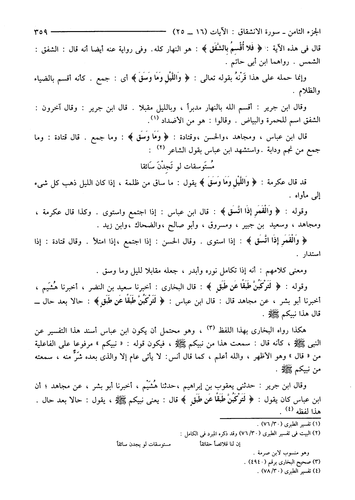وَقَالَ ابْنُ جَرِيرٍ: أَقْسَمَ اللَّهُ بِالنَّهَارِ مُدْبِرًا، وَبِاللَّيْلِ مُقْبِلًا. وَقَالَ ابْنُ جَرِيرٍ: وَقَالَ آخَرُونَ: الشَّفَقُ اسْمٌ لِلْحُمْرَةِ وَالْبَيَاضِ. وَقَالُوا: هُوَ مِنَ الْأَضْدَادِ (1) .