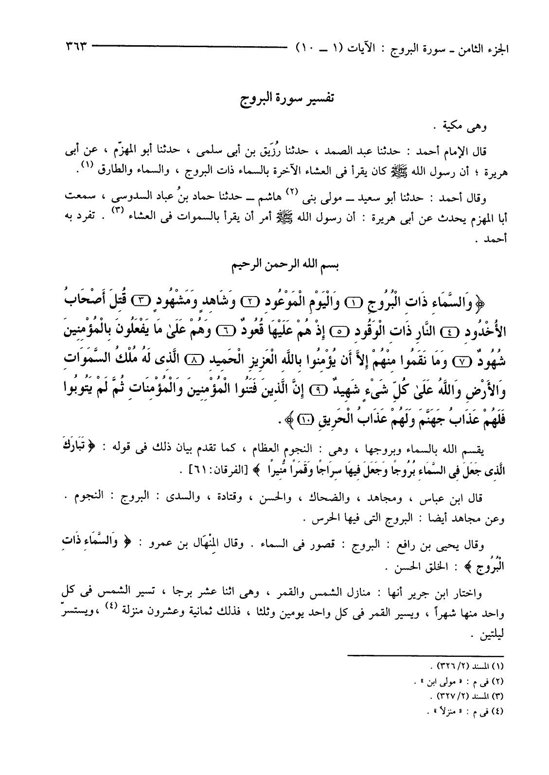 يُقْسِمُ اللَّهُ بِالسَّمَاءِ وَبُرُوجِهَا، وَهِيَ: النُّجُومُ الْعِظَامُ، كَمَا تَقَدَّمَ بَيَانُ ذَلِكَ فِي قَوْلِهِ: {تَبَارَكَ الَّذِي جَعَلَ فِي السَّمَاءِ بُرُوجًا وَجَعَلَ فِيهَا سِرَاجًا وَقَمَرًا مُنِيرًا} [الْفُرْقَانِ: 61] .