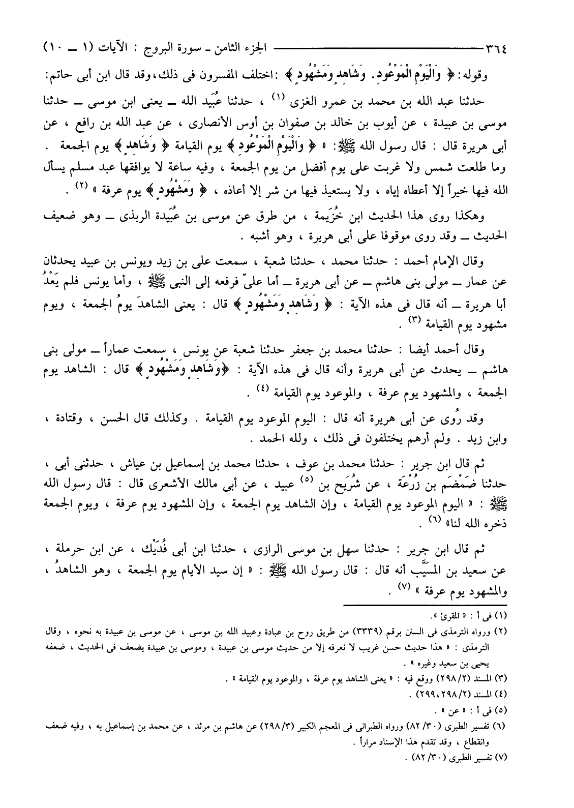 وَقَالَ أَحْمَدُ أَيْضًا: حَدَّثَنَا مُحَمَّدُ بْنُ جَعْفَرٍ حَدَّثَنَا شُعْبَةُ عَنْ يُونُسَ، سَمِعْتُ عَمَّارًا-مَوْلَى بَنِي هَاشِمٍ-يُحَدِّثُ عَنْ أَبِي هُرَيْرَةَ وَأَنَّهُ قَالَ فِي هَذِهِ الْآيَةِ: {وَشَاهِدٍ وَمَشْهُودٍ} قَالَ: الشَّاهِدُ يَوْمُ الْجُمُعَةِ، وَالْمَشْهُودُ يَوْمُ عَرَفَةَ، وَالْمَوْعُودُ يَوْمُ الْقِيَامَةِ (4) .