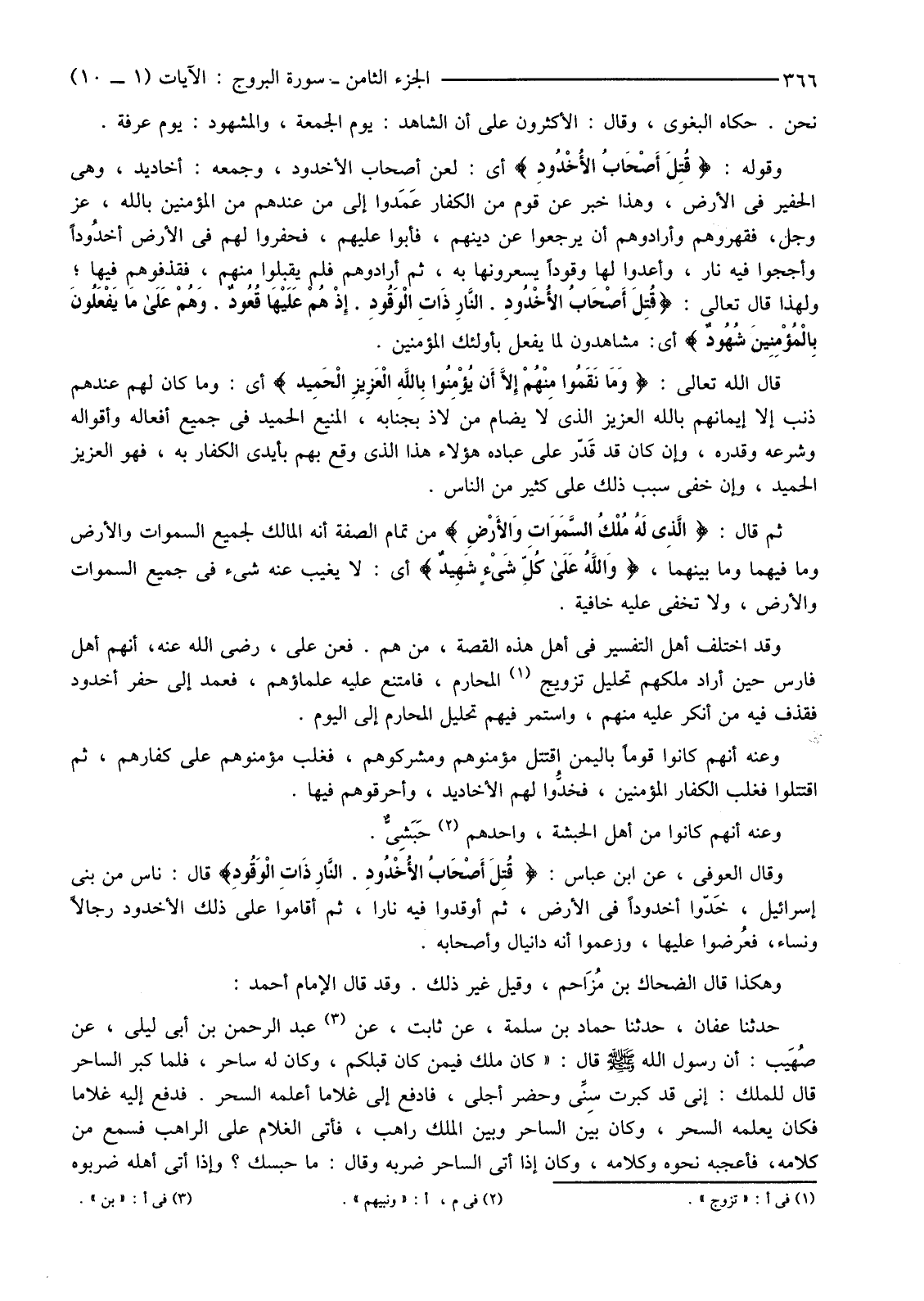 وَقَوْلُهُ: {قُتِلَ أَصْحَابُ الأخْدُودِ} أَيْ: لُعِنُ أَصْحَابُ الْأُخْدُودِ، وَجَمْعُهُ: أَخَادِيدُ، وَهِيَ الْحَفِيرُ فِي الْأَرْضِ، وَهَذَا خَبَرٌ عَنْ قَوْمٍ مِنَ الْكُفَّارِ عَمَدوا إِلَى مَنْ عِنْدَهُمْ مِنَ الْمُؤْمِنِينَ بِاللَّهِ، عَزَّ وَجَلَّ، فَقَهَرُوهُمْ وَأَرَادُوهُمْ أَنْ يَرْجِعُوا عَنْ دِينِهِمْ، فَأَبَوْا عَلَيْهِمْ، فَحَفَرُوا لَهُمْ فِي الْأَرْضِ أخدُودًا وَأَجَّجُوا فيه نار، وَأَعَدُّوا لَهَا وَقُودًا يُسَعِّرُونَهَا بِهِ، ثُمَّ أَرَادُوهُمْ فَلَمْ يَقْبَلُوا مِنْهُمْ، فَقَذَفُوهُمْ فِيهَا؛ وَلِهَذَا قَالَ تَعَالَى: {قُتِلَ أَصْحَابُ الأخْدُودِ النَّارِ ذَاتِ الْوَقُودِ إِذْ هُمْ عَلَيْهَا قُعُودٌ وَهُمْ عَلَى مَا يَفْعَلُونَ بِالْمُؤْمِنِينَ شُهُودٌ} أَيْ: مُشَاهِدُونَ لِمَا يُفْعَلُ بِأُولَئِكَ الْمُؤْمِنِينَ.