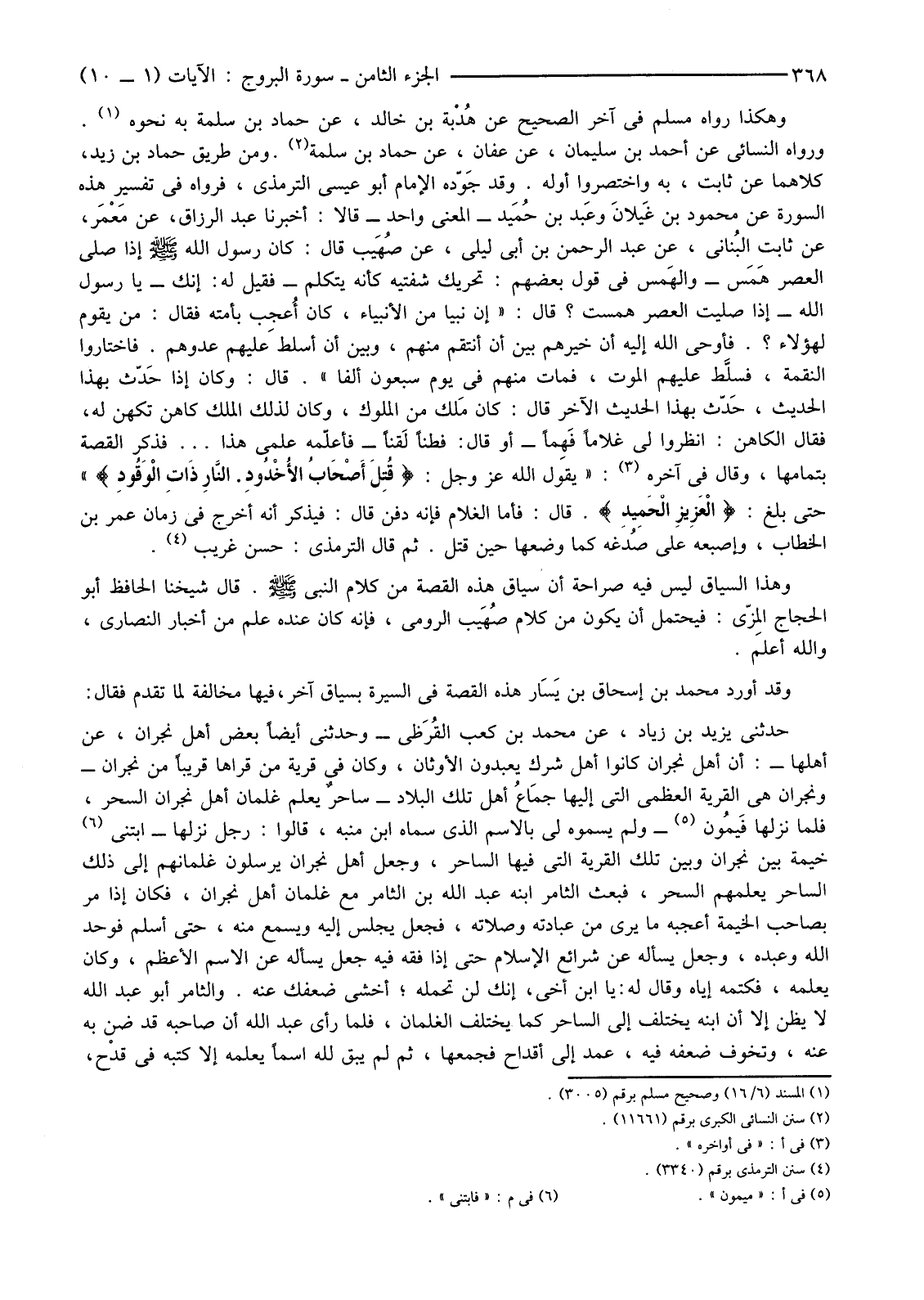 وَهَكَذَا رَوَاهُ مُسْلِمٌ فِي آخِرِ الصَّحِيحِ عَنْ هُدْبة بْنِ خَالِدٍ، عَنْ حَمَّادِ بْنِ سَلَمَةَ بِهِ نَحْوَهُ (1) وَرَوَاهُ النَّسَائِيُّ عَنْ أَحْمَدَ بْنِ سُلَيْمَانَ، عَنْ عَفَّانَ، عَنْ حَمَّادِ بْنِ سَلَمَةَ (2) وَمِنْ طَرِيقِ حَمَّادِ بْنِ زَيْدٍ، كِلَاهُمَا عَنْ ثَابِتٍ، بِهِ وَاخْتَصَرُوا أَوَّلَهُ. وَقَدْ جَوّده الْإِمَامُ أَبُو عِيسَى التِّرْمِذِيُّ، فَرَوَاهُ فِي تَفْسِيرِ هَذِهِ السُّورَةِ عَنْ مَحْمُودِ بْنِ غَيلانَ وعَبد بْنِ حُمَيد-الْمَعْنَى وَاحِدٌ-قَالَا أَخْبَرَنَا عَبْدُ الرَّزَّاقِ، عَنْ مَعْمَر، عَنْ ثَابِتٍ البُناني، عَنْ عَبْدِ الرَّحْمَنِ بْنِ أَبِي لَيْلَى، عَنْ صُهَيب قَالَ: كَانَ رَسُولُ اللَّهِ صَلَّى اللَّهُ عَلَيْهِ وسلم إِذَا صَلَّى الْعَصْرَ هَمَس-والهَمس فِي قَوْلِ بَعْضِهِمْ: تَحْرِيكُ شَفَتَيْهِ كَأَنَّهُ يَتَكَلَّمُ-فَقِيلَ لَهُ: إِنَّكَ-يَا رَسُولَ اللَّهِ-إِذَا صَلَّيْتَ الْعَصْرَ هَمَسْتَ؟ قَالَ: "إِنْ نَبِيًّا مِنَ الْأَنْبِيَاءِ، كَانَ أُعجِب بِأُمَّتِهِ فَقَالَ: مَنْ يَقُومُ لِهَؤُلَاءِ؟. فَأَوْحَى اللَّهُ إِلَيْهِ أَنْ خَيِّرْهُمْ بَيْنَ أَنْ أَنْتَقِمَ مِنْهُمْ، وَبَيْنَ أَنْ أُسَلِّطَ عَلَيْهِمْ عَدُوَّهُمْ. فَاخْتَارُوا النِّقْمَةَ، فسلَّط عَلَيْهِمُ الْمَوْتَ، فَمَاتَ مِنْهُمْ فِي يَوْمٍ سَبْعُونَ أَلْفًا". قَالَ: وَكَانَ إِذَا حَدّث بِهَذَا الْحَدِيثِ، حَدّث بِهَذَا الْحَدِيثِ الْآخَرِ قَالَ: كَانَ مَلك مِنَ الْمُلُوكِ، وَكَانَ لِذَلِكَ الْمَلِكِ كَاهِنٌ تَكَهَّنَ لَهُ، فَقَالَ الْكَاهِنُ: انْظُرُوا لِي غُلَامًا فَهِمًا-أَوْ قَالَ: فَطِنًا لَقنًا-فَأُعَلِّمَهُ عِلْمِي هَذَا فَذَكَرَ الْقِصَّةَ بِتَمَامِهَا، وَقَالَ فِي آخِرِهِ (3) يَقُولُ اللَّهُ عَزَّ وَجَلَّ: {قُتِلَ أَصْحَابُ الأخْدُودِ النَّارِ ذَاتِ الْوَقُودِ} حَتَّى بَلَغَ: {الْعَزِيزِ الْحَمِيدِ} قَالَ: فَأَمَّا الْغُلَامُ فَإِنَّهُ دُفِنَ قَالَ: فَيُذْكَرُ أَنَّهُ أُخْرِجَ فِي زَمَانِ عُمَرَ بْنِ الْخَطَّابِ، وَإِصْبُعُهُ عَلَى صُدغه كَمَا وَضَعَهَا حِينَ قُتِلَ. ثُمَّ قَالَ التِّرْمِذِيُّ: حَسَنٌ غَرِيبٌ (4) .