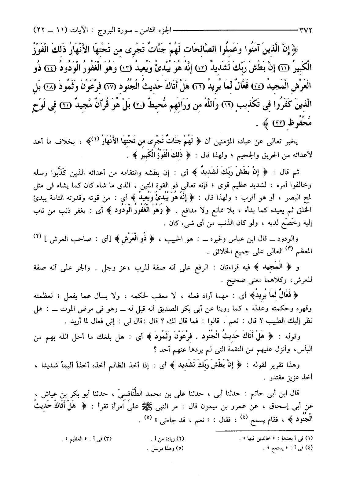 وَالْوَدُودُ-قَالَ ابْنُ عَبَّاسٍ وَغَيْرُهُ-: هُوَ الْحَبِيبُ، {ذُو الْعَرْشِ} [أَيْ: صَاحِبُ الْعَرْشِ] (2) الْمُعَظَّمِ (3) الْعَالِي عَلَى جَمِيعِ الْخَلَائِقِ.