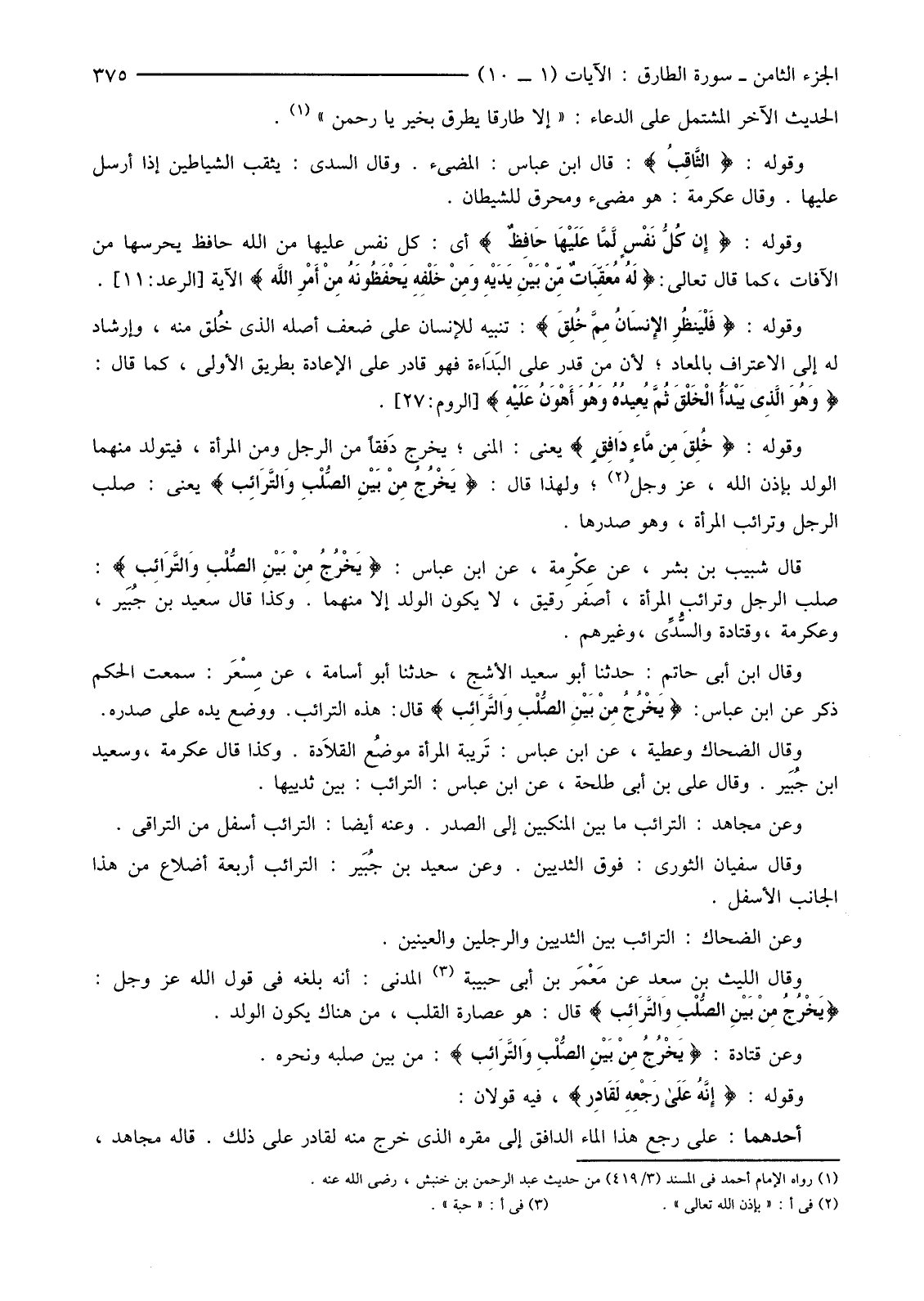 وَقَوْلُهُ: {خُلِقَ مِنْ مَاءٍ دَافِقٍ} يَعْنِي: الْمَنِيُّ؛ يَخْرُجُ دَفقًا مِنَ الرَّجُلِ وَمِنَ الْمَرْأَةِ، فَيَتَوَلَّدُ مِنْهُمَا الْوَلَدُ بِإِذْنِ اللَّهِ، عَزَّ وَجَلَّ (2) ؛ وَلِهَذَا قَالَ: {يَخْرُجُ مِنْ بَيْنِ الصُّلْبِ وَالتَّرَائِبِ} يَعْنِي: صُلْبَ الرَّجُلِ وَتَرَائِبَ الْمَرْأَةِ، وَهُوَ صَدْرُهَا.