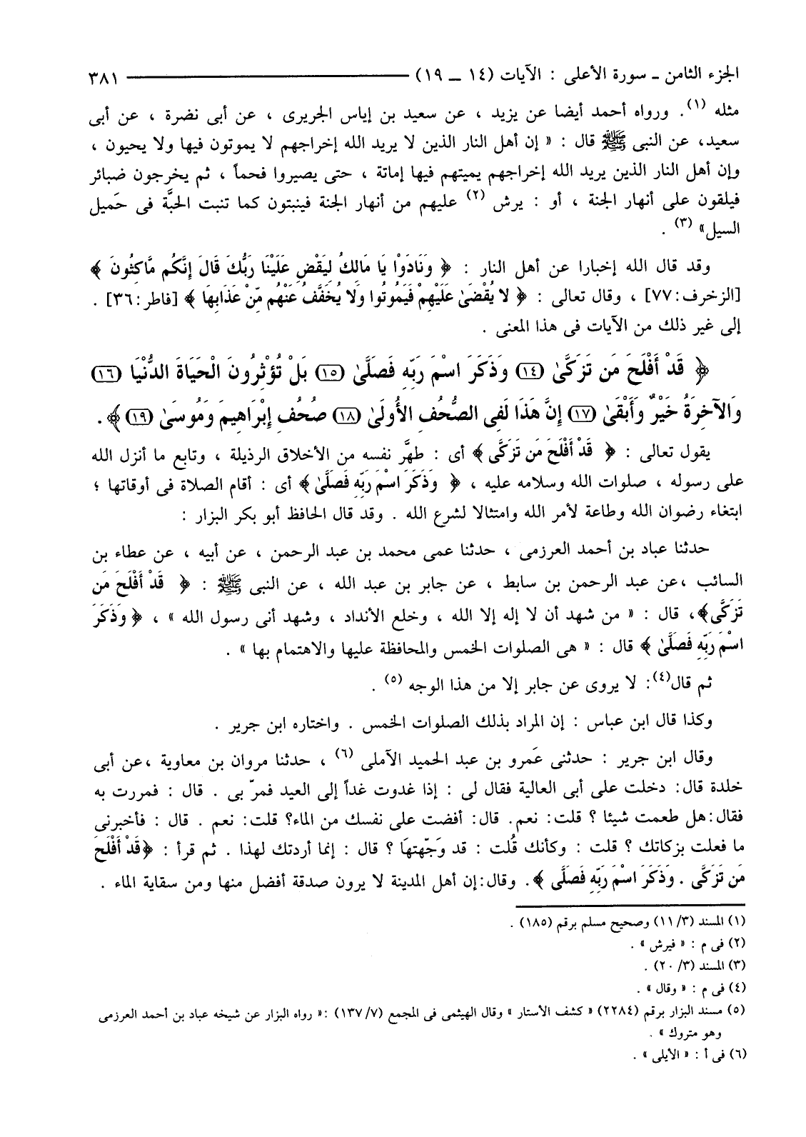 حَدَّثَنَا عَبَّادُ بْنُ أَحْمَدَ الْعَرْزَمِيُّ، حَدَّثَنَا عَمِّي مُحَمَّدِ بْنِ عَبْدِ الرَّحْمَنِ، عَنْ أَبِيهِ، عَنْ عَطَاءُ بْنُ السَّائِبِ، عَنْ عَبْدِ الرَّحْمَنِ بْنِ سَابِطٍ، عَنْ جَابِرِ بْنِ عَبْدِ اللَّهِ، عَنِ النَّبِيِّ صَلَّى اللَّهُ عَلَيْهِ وَسَلَّمَ: {قَدْ أَفْلَحَ مَنْ تَزَكَّى} قَالَ: "مَنْ شَهِدَ أَنْ لَا إِلَهَ إِلَّا اللَّهُ، وَخَلَعَ الْأَنْدَادَ، وَشَهِدَ أَنِّي رَسُولُ اللَّهِ"، {وَذَكَرَ اسْمَ رَبِّهِ فَصَلَّى} قَالَ: "هِيَ الصَّلَوَاتُ الْخَمْسُ وَالْمُحَافَظَةُ عَلَيْهَا وَالِاهْتِمَامُ بِهَا".