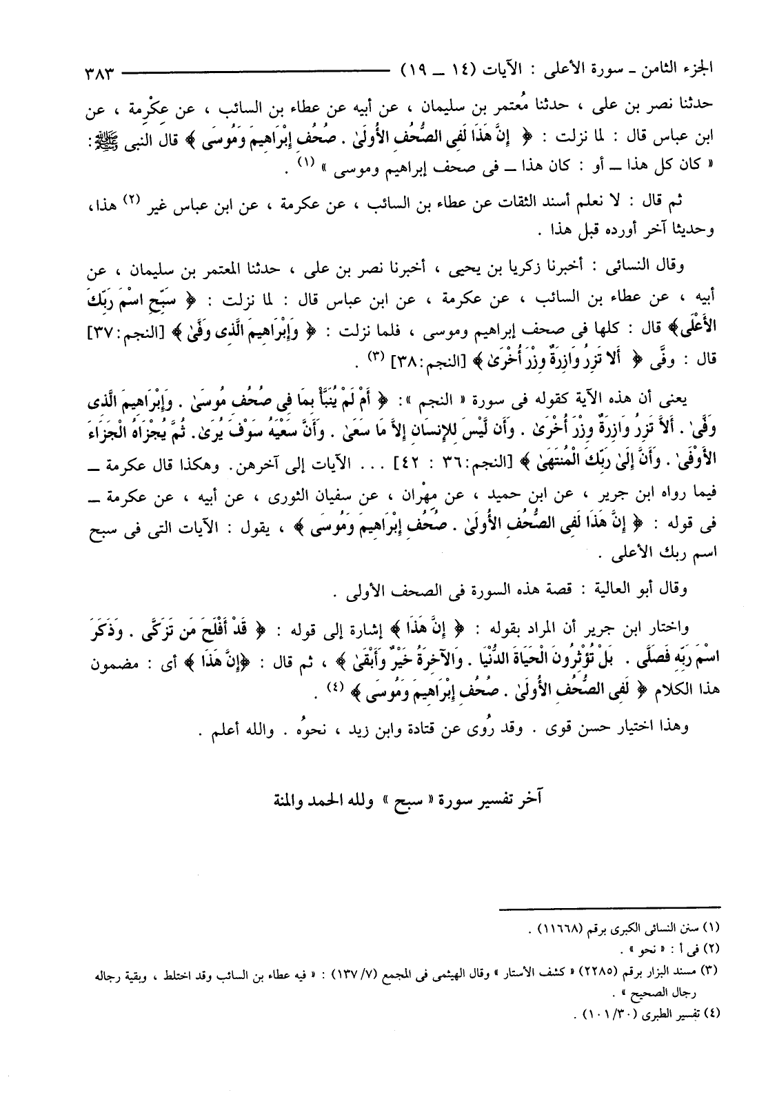 وَقَالَ النَّسَائِيُّ: أَخْبَرَنَا زَكَرِيَّا بْنُ يَحْيَى، أَخْبَرَنَا نَصْرُ بْنُ عَلِيٍّ، حَدَّثَنَا الْمُعْتَمِرُ بْنُ سُلَيْمَانَ، عَنْ أَبِيهِ، عَنِ عَطَاءِ بْنِ السَّائِبِ، عَنْ عِكْرِمَةَ، عَنِ ابْنِ عَبَّاسٍ قَالَ: لَمَّا نَزَلَتْ {سَبِّحِ اسْمَ رَبِّكَ الأعْلَى} قَالَ: كُلُّهَا فِي صُحُفِ إِبْرَاهِيمَ وَمُوسَى، فَلَمَّا نَزَلَتْ: {وَإِبْرَاهِيمَ الَّذِي وَفَّى} [النَّجْمِ:37] قَالَ: وفَّى {أَلا تَزِرُ وَازِرَةٌ وِزْرَ أُخْرَى} [النَّجْمِ:38] (3) .