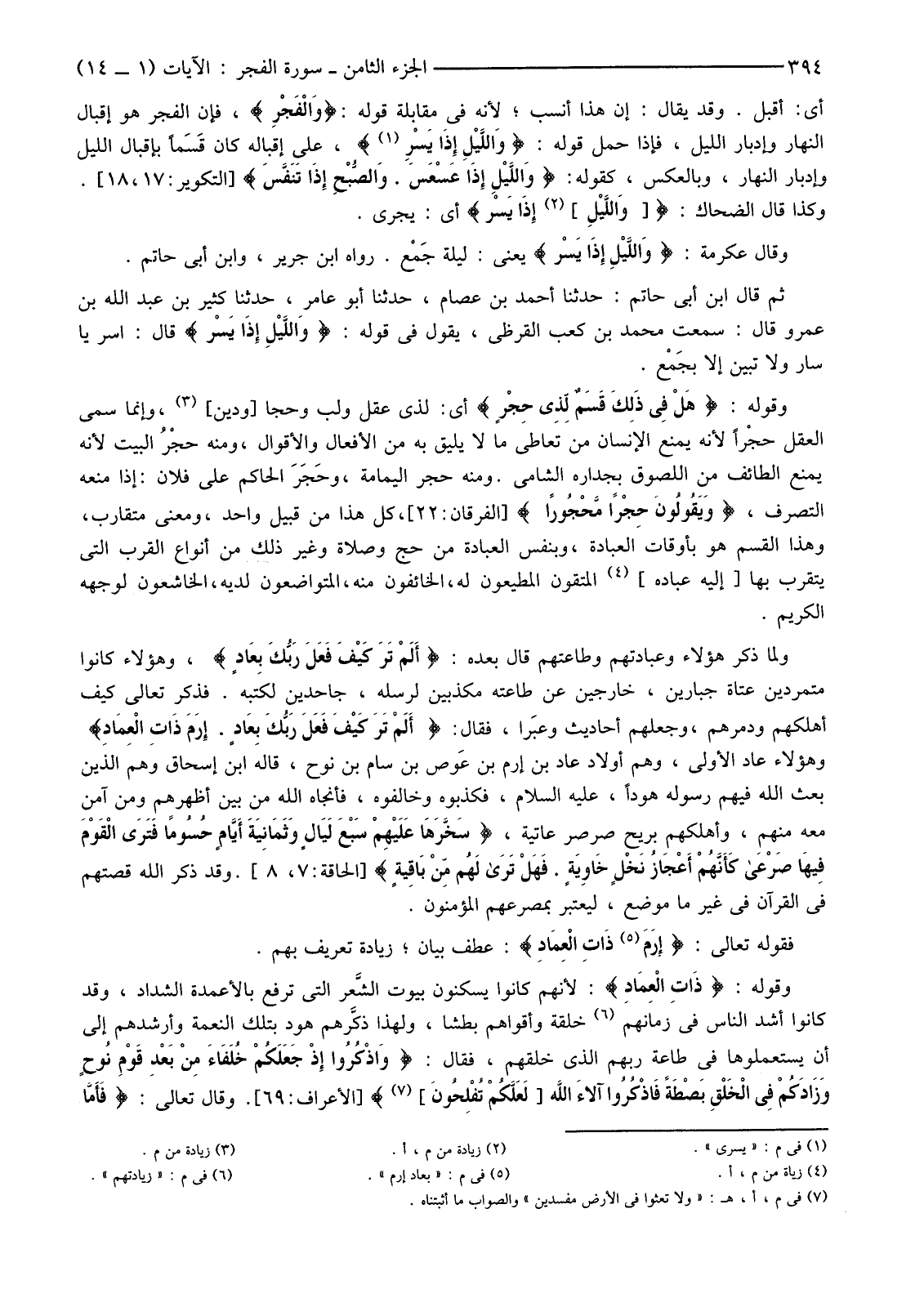 وَقَوْلُهُ: {هَلْ فِي ذَلِكَ قَسَمٌ لِذِي حِجْرٍ} أَيْ: لِذِي عَقْلٍ وَلُبٍّ وَحِجَا [وَدِينٍ] (3) وَإِنَّمَا سُمِّيَ الْعَقْلُ حجْرًا لِأَنَّهُ يَمْنَعُ الْإِنْسَانَ مِنْ تَعَاطِي مَا لَا يَلِيقُ بِهِ مِنَ الْأَفْعَالِ وَالْأَقْوَالِ، وَمِنْهُ حجْرُ الْبَيْتِ لِأَنَّهُ يَمْنَعُ الطَّائِفَ مِنَ اللُّصُوقِ بِجِدَارِهِ الشَّامِيِّ. وَمِنْهُ حِجْرُ الْيَمَامَةِ، وحَجَرَ الْحَاكِمُ عَلَى فُلَانٍ: إِذَا مَنَعَهُ التَّصَرُّفَ، {وَيَقُولُونَ حِجْرًا مَحْجُورًا} [الْفُرْقَانِ:22] ، كُلُّ هَذَا مِنْ قَبِيلٍ وَاحِدٍ، وَمَعْنًى مُتَقَارِبٍ، وَهَذَا الْقَسَمُ هُوَ بِأَوْقَاتِ الْعِبَادَةِ، وَبِنَفْسِ الْعِبَادَةِ مِنْ حَجٍّ وَصَلَاةٍ وَغَيْرِ ذَلِكَ مِنْ أَنْوَاعِ الْقُرَبِ الَّتِي يَتَقَرَّبُ بِهَا [إِلَيْهِ عِبَادُهُ] (4) الْمُتَّقُونَ الْمُطِيعُونَ لَهُ، الْخَائِفُونَ مِنْهُ، الْمُتَوَاضِعُونَ لَدَيْهِ، الْخَاشِعُونَ لِوَجْهِهِ الْكَرِيمِ.
