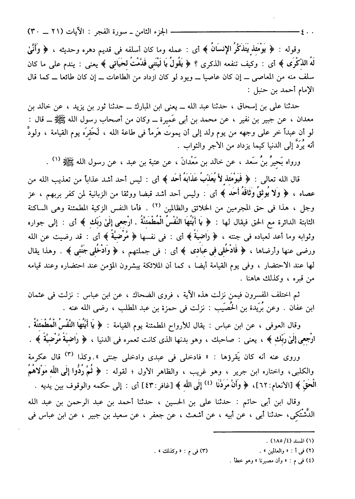 قَالَ اللَّهُ تَعَالَى: {فَيَوْمَئِذٍ لَا يُعَذِّبُ عَذَابَهُ أَحَدٌ} أَيْ: لَيْسَ أَحَدٌ أَشَدَّ عَذَابًا مِنْ تَعْذِيبِ اللَّهِ مَنْ عَصَاهُ، {وَلا يُوثِقُ وَثَاقَهُ أَحَدٌ} أَيْ: وَلَيْسَ أَحَدٌ أَشَدَّ قَبْضًا وَوَثْقًا مِنَ الزَّبَانِيَةِ لِمَنْ كَفَرَ بِرَبِّهِمْ، عَزَّ وَجَلَّ، هَذَا فِي حَقِّ الْمُجْرِمِينَ مِنَ الْخَلَائِقِ وَالظَّالِمِينَ (2) فَأَمَّا النَّفْسُ الزَّكِيَّةُ الْمُطْمَئِنَّةُ وَهِيَ السَّاكِنَةُ الثَّابِتَةُ الدَّائِرَةُ مَعَ الْحَقِّ فَيُقَالُ لَهَا: {يَا أَيَّتُهَا النَّفْسُ الْمُطْمَئِنَّةُ ارْجِعِي إِلَى رَبِّكِ} أَيْ: إِلَى جِوَارِهِ وَثَوَابِهِ وَمَا أَعَدَّ لِعِبَادِهِ فِي جَنَّتِهِ، {رَاضِيَةً} أَيْ: فِي نَفْسِهَا {مَرْضِيَّةً} أَيْ: قَدْ رَضِيَتْ عَنِ اللَّهِ وَرَضِيَ عَنْهَا وَأَرْضَاهَا، {فَادْخُلِي فِي عِبَادِي} أَيْ: فِي جُمْلَتِهِمْ، {وَادْخُلِي جَنَّتِي} وَهَذَا يُقَالُ لَهَا عِنْدَ الِاحْتِضَارِ، وَفِي يَوْمِ الْقِيَامَةِ أَيْضًا، كَمَا أَنَّ الْمَلَائِكَةَ يُبَشِّرُونَ الْمُؤْمِنَ عِنْدَ احْتِضَارِهِ وَعِنْدَ قِيَامِهِ مِنْ قَبْرِهِ، وَكَذَلِكَ هَاهُنَا.