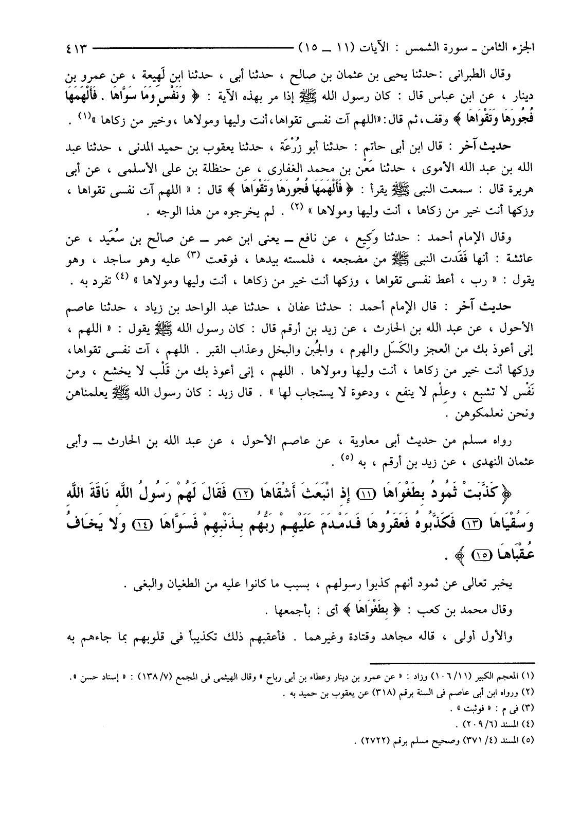 {كَذَّبَتْ ثَمُودُ بِطَغْوَاهَا (11) إِذِ انْبَعَثَ أَشْقَاهَا (12) فَقَالَ لَهُمْ رَسُولُ اللَّهِ نَاقَةَ اللَّهِ وَسُقْيَاهَا (13) فَكَذَّبُوهُ فَعَقَرُوهَا فَدَمْدَمَ عَلَيْهِمْ رَبُّهُمْ بِذَنْبِهِمْ فَسَوَّاهَا (14) وَلا يَخَافُ عُقْبَاهَا (15) }