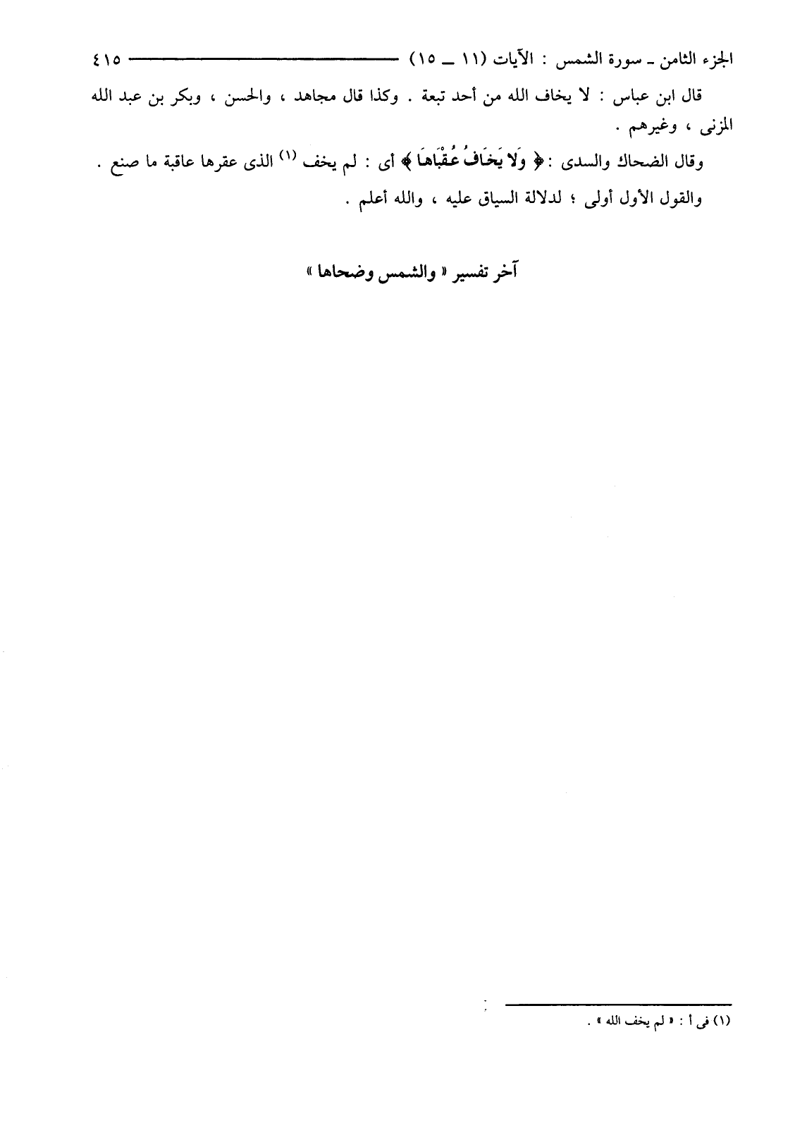 وَقَالَ الضَّحَّاكُ وَالسُّدِّيُّ: {وَلا يَخَافُ عُقْبَاهَا} أَيْ: لَمْ يَخَفِ (1) الَّذِي عَقَرَهَا عَاقِبَةَ مَا صَنَعَ. وَالْقَوْلُ الْأَوَّلُ أَوْلَى؛ لِدَلَالَةِ السِّيَاقِ عَلَيْهِ، وَاللَّهُ أَعْلَمُ.