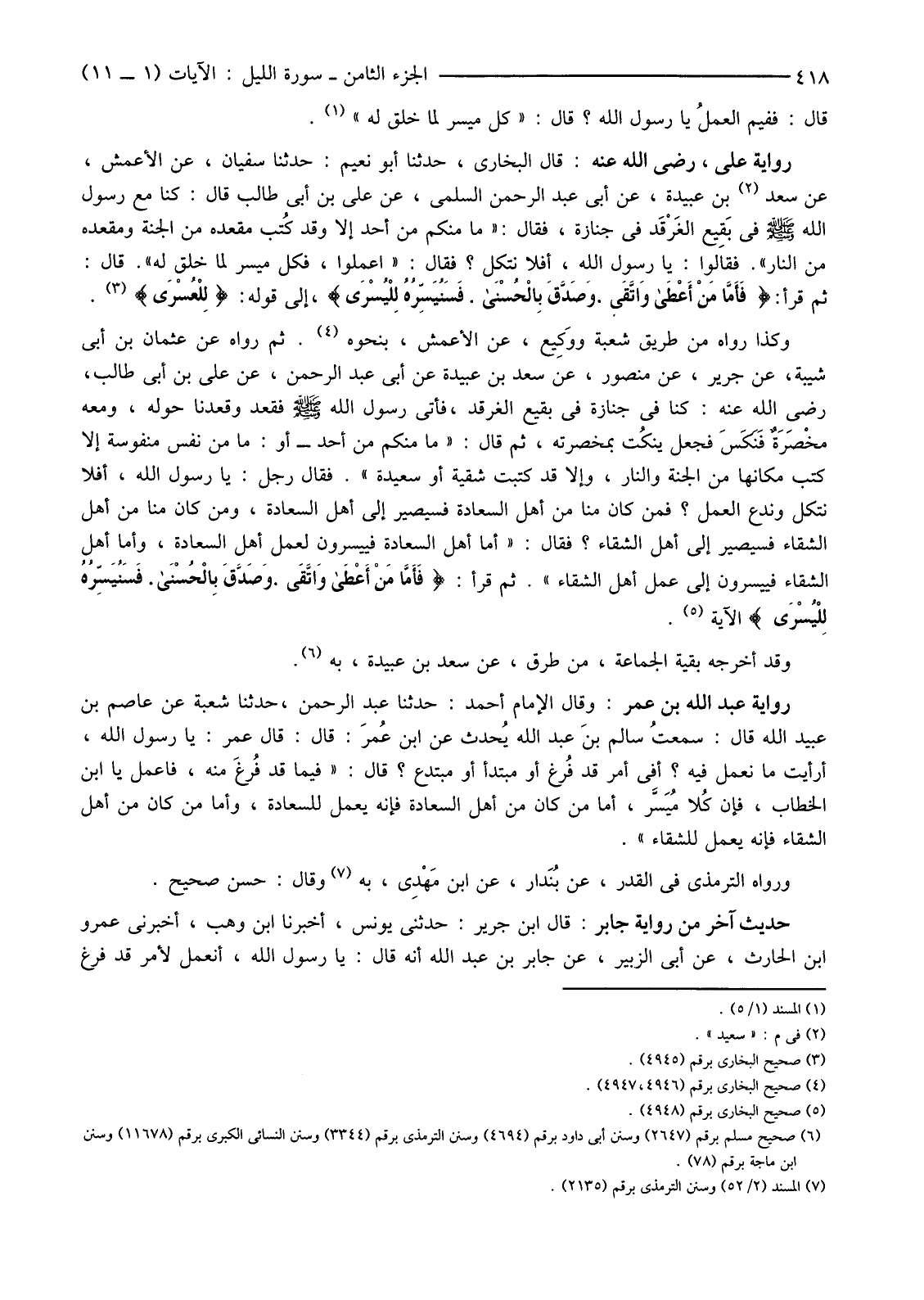 رِوَايَةُ عَلِيٍّ، رَضِيَ اللَّهُ عَنْهُ: قَالَ الْبُخَارِيُّ، حَدَّثَنَا أَبُو نُعَيْمٍ: حَدَّثَنَا سُفْيَانُ، عَنِ الْأَعْمَشِ، عَنْ سَعْدِ (2) بْنِ عُبَيْدَةَ، عَنْ أَبِي عَبْدِ الرَّحْمَنِ السُّلَمِيِّ، عَنْ عَلِيِّ بْنِ أَبِي طَالِبٍ قَالَ: كُنَّا مَعَ رَسُولِ اللَّهِ صَلَّى اللَّهُ عَلَيْهِ وَسَلَّمَ فِي بَقِيع الغَرْقَد فِي جِنَازَةٍ، فَقَالَ: "مَا مِنْكُمْ مِنْ أَحَدٍ إِلَّا وَقَدْ كُتب مَقْعَدُهُ مِنَ الْجَنَّةِ وَمَقْعَدُهُ مِنَ النَّارِ". فَقَالُوا: يَا رَسُولَ اللَّهِ، أَفَلَا نَتَّكِلُ؟ فَقَالَ: "اعْمَلُوا، فَكُلٌّ مُيَسَّرٌ لِمَا خُلِقَ لَهُ". قَالَ: ثُمَّ قَرَأَ: {فَأَمَّا مَنْ أَعْطَى وَاتَّقَى وَصَدَّقَ بِالْحُسْنَى فَسَنُيَسِّرُهُ لِلْيُسْرَى} إِلَى قَوْلِهِ: {لِلْعُسْرَى} (3) .