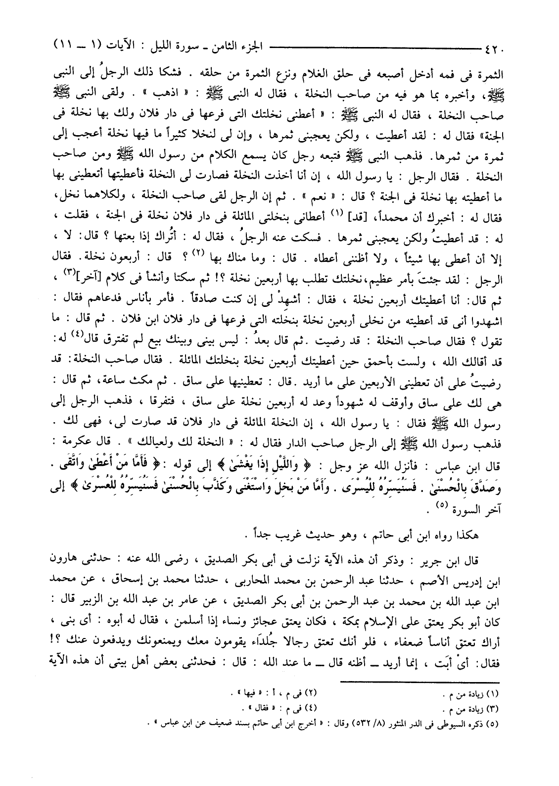 الثَّمَرَةَ فِي فَمِهِ أَدْخَلَ أُصْبُعَهُ فِي حَلْقِ الْغُلَامِ وَنَزَعَ الثَّمَرَةَ مَنْ حَلْقِهِ. فَشَكَا ذَلِكَ الرجلُ إِلَى النَّبِيِّ صَلَّى اللَّهُ عَلَيْهِ وَسَلَّمَ، وَأَخْبَرَهُ بِمَا هُوَ فِيهِ مِنْ صَاحِبِ النَّخْلَةِ، فَقَالَ لَهُ النَّبِيُّ صَلَّى اللَّهُ عَلَيْهِ وَسَلَّمَ: "اذْهَبْ". وَلَقِيَ النَّبِيُّ صَلَّى اللَّهُ عَلَيْهِ وَسَلَّمَ صاحب النخلة، فَقَالَ لَهُ النَّبِيُّ صَلَّى اللَّهُ عَلَيْهِ وَسَلَّمَ: "أَعْطِنِي نَخْلَتَكَ الَّتِي فَرْعُهَا فِي دَارِ فُلَانٍ وَلَكَ بِهَا نَخْلَةٌ فِي الْجَنَّةِ" فَقَالَ لَهُ: لَقَدْ أَعْطَيْتُ، وَلَكِنْ يُعْجِبُنِي ثَمَرُهَا، وَإِنَّ لِي لَنَخْلًا كَثِيرًا مَا فِيهَا نَخْلَةٌ أَعْجَبُ إِلَيَّ ثَمَرَةً مِنْ ثَمَرِهَا. فَذَهَبَ النَّبِيُّ صَلَّى اللَّهُ عَلَيْهِ وَسَلَّمَ فَتَبِعَهُ رَجُلٌ كَانَ يَسْمَعُ الْكَلَامَ مِنْ رَسُولِ اللَّهِ صَلَّى اللَّهُ عَلَيْهِ وَسَلَّمَ وَمِنْ صَاحِبِ النَّخْلَةِ. فَقَالَ الرَّجُلُ: يَا رَسُولَ اللَّهِ، إِنْ أَنَا أَخَذْتُ النَّخْلَةَ فَصَارَتْ لِي النَّخْلَةُ فَأَعْطَيْتُهَا أَتُعْطِينِي بِهَا مَا أَعْطَيْتَهُ بِهَا نَخْلَةً فِي الْجَنَّةِ؟ قَالَ: "نَعَمْ". ثُمَّ إِنَّ الرَّجُلَ لَقِيَ صَاحِبَ النَّخْلَةِ، وَلِكِلَاهُمَا نَخْلٌ، فَقَالَ لَهُ: أُخْبِرُكَ أَنَّ مُحَمَّدًا، [قَدْ] (1) أَعْطَانِي بِنَخْلَتِي الْمَائِلَةِ فِي دَارِ فُلَانٍ نَخْلَةً فِي الْجَنَّةِ، فَقُلْتُ، لَهُ: قَدْ أعطيتُ وَلَكِنْ يُعْجِبُنِي ثَمَرُهَا. فَسَكَتَ عَنْهُ الرجلُ، فَقَالَ لَهُ: أتُراك إِذَا بِعْتَهَا؟ قَالَ: لَا إِلَّا أَنْ أُعْطَى بِهَا شَيْئًا، وَلَا أَظُنُّنِي أُعْطَاهُ. قَالَ: وَمَا مُنَاكَ بِهَا (2) ؟ قَالَ: أَرْبَعُونَ نَخْلَةً. فَقَالَ الرَّجُلُ: لَقَدْ جئتَ بِأَمْرٍ عَظِيمٍ، نَخْلَتُكَ تَطْلُبُ بِهَا أَرْبَعِينَ نَخْلَةً؟! ثُمَّ سَكَتَا وَأَنْشَأَ فِي كَلَامٍ [آخَرَ] (3) ثُمَّ قَالَ: أَنَا أَعْطَيْتُكَ أَرْبَعِينَ نَخْلَةً، فَقَالَ: أَشْهِدْ لِي إِنْ كُنْتَ صَادِقًا. فَأَمَرَ بِأُنَاسٍ فَدَعَاهُمْ فَقَالَ: اشْهَدُوا أَنِّي قَدْ أَعْطَيْتُهُ مِنْ نَخْلِي أَرْبَعِينَ نَخْلَةً بِنَخْلَتِهِ الَّتِي فَرْعُهَا فِي دَارِ فُلَانِ ابْنِ فُلَانٍ. ثُمَّ قَالَ: مَا تَقَوُّلُ؟ فَقَالَ صَاحِبُ النَّخْلَةِ: قَدْ رَضِيتُ. ثُمَّ قَالَ بعدُ: لَيْسَ بَيْنِي وَبَيْنَكَ بَيْعٌ لَمْ نَفْتَرِقْ قَالَ (4) لَهُ: قَدْ أَقَالَكَ اللَّهُ، وَلَسْتُ بِأَحْمَقَ حِينَ أَعْطَيْتُكَ أَرْبَعِينَ نَخْلَةً بِنَخْلَتِكَ الْمَائِلَةِ. فَقَالَ صَاحِبُ النَّخْلَةِ: قَدْ رضيتُ عَلَى أَنْ تُعْطِيَنِي الْأَرْبَعِينَ عَلَى مَا أُرِيدُ. قَالَ: تُعْطِينِيهَا عَلَى سَاقٍ. ثُمَّ مَكَثَ سَاعَةً، ثُمَّ قَالَ: هِيَ لَكَ عَلَى سَاقٍ وَأَوْقَفَ لَهُ شُهُودًا وَعَدَّ لَهُ أَرْبَعِينَ نَخْلَةً عَلَى سَاقٍ، فَتَفَرَّقَا، فَذَهَبَ الرَّجُلُ إِلَى رَسُولِ اللَّهِ صَلَّى اللَّهُ عَلَيْهِ وَسَلَّمَ فَقَالَ: يَا رَسُولَ اللَّهِ، إِنَّ النَّخْلَةَ الْمَائِلَةَ فِي دَارِ فُلَانٍ قَدْ صَارَتْ لِي، فَهِيَ لَكَ. فَذَهَبَ رَسُولُ اللَّهِ صَلَّى اللَّهُ عَلَيْهِ وَسَلَّمَ إِلَى الرَّجُلِ صَاحِبِ الدَّارِ فَقَالَ لَهُ: "النَّخْلَةُ لَكَ وَلِعِيَالِكَ". قَالَ عِكْرِمَةُ: قَالَ ابْنُ عَبَّاسٍ: فَأَنْزَلَ اللَّهُ عَزَّ وَجَلَّ: {وَاللَّيْلِ إِذَا يَغْشَى} إِلَى قَوْلِهِ: {فَأَمَّا مَنْ أَعْطَى وَاتَّقَى وَصَدَّقَ بِالْحُسْنَى فَسَنُيَسِّرُهُ لِلْيُسْرَى وَأَمَّا مَنْ بَخِلَ وَاسْتَغْنَى وَكَذَّبَ بِالْحُسْنَى فَسَنُيَسِّرُهُ لِلْعُسْرَى} إِلَى آخِرِ السُّورَةِ (5) .