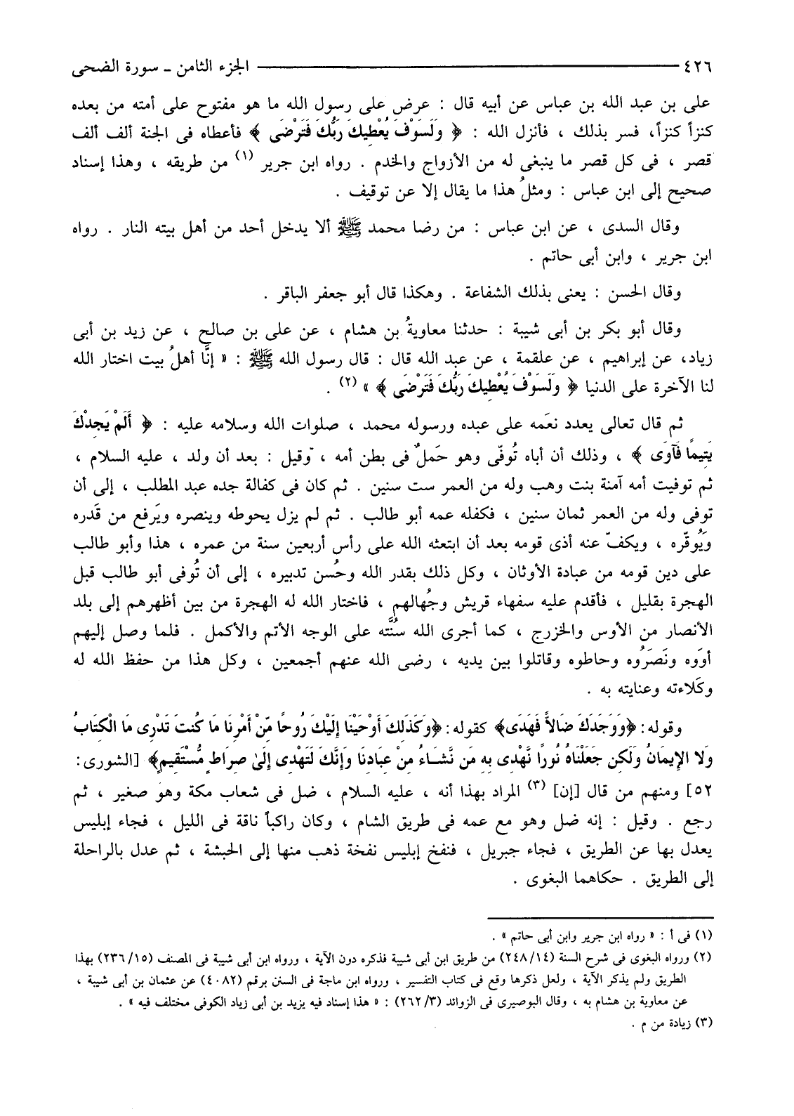 عَلِيِّ بْنِ عَبْدِ اللَّهِ بْنِ عَبَّاسٍ عَنْ أَبِيهِ قَالَ: عُرِضَ عَلَى رَسُولِ اللَّهِ مَا هُوَ مَفْتُوحٌ عَلَى أُمَّتِهِ مِنْ بَعْدِهِ كَنْزًا كَنْزًا، فَسُرَّ بِذَلِكَ، فَأَنْزَلَ اللَّهُ: {وَلَسَوْفَ يُعْطِيكَ رَبُّكَ فَتَرْضَى} فَأَعْطَاهُ فِي الْجَنَّةِ أَلْفَ أَلْفَ قَصْرٍ، فِي كُلِّ قَصْرٍ مَا يَنْبَغِي لَهُ مِنَ الْأَزْوَاجِ وَالْخَدَمِ. رَوَاهُ ابْنُ جَرِيرٍ (1) مِنْ طَرِيقِهِ، وَهَذَا إِسْنَادٌ صَحِيحٌ إِلَى ابْنِ عَبَّاسٍ: ومثلُ هَذَا مَا يُقَالُ إِلَّا عَنْ تَوْقِيفٍ.
