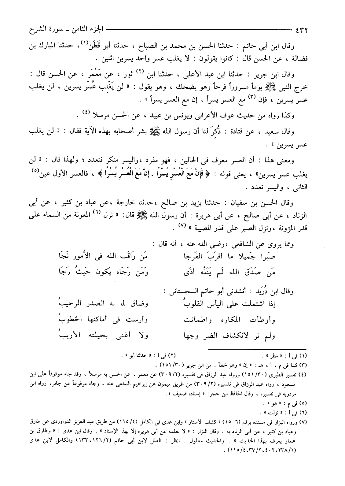 وَمَعْنَى هَذَا: أَنَّ الْعُسْرَ مُعَرَّفٌ فِي الْحَالَيْنِ، فَهُوَ مُفْرَدٌ، وَالْيُسْرُ مُنَكَّرٌ فَتَعَدَّدَ؛ وَلِهَذَا قَالَ: "لَنْ يَغْلِبَ عُسْرٌ يُسْرَيْنِ"، يَعْنِي قَوْلَهُ: {فَإِنَّ مَعَ الْعُسْرِ يُسْرًا إِنَّ مَعَ الْعُسْرِ يُسْرًا} فَالْعُسْرُ الْأَوَّلُ عَيْنُ (5) الثَّانِي وَالْيُسْرُ تَعَدَّدَ.