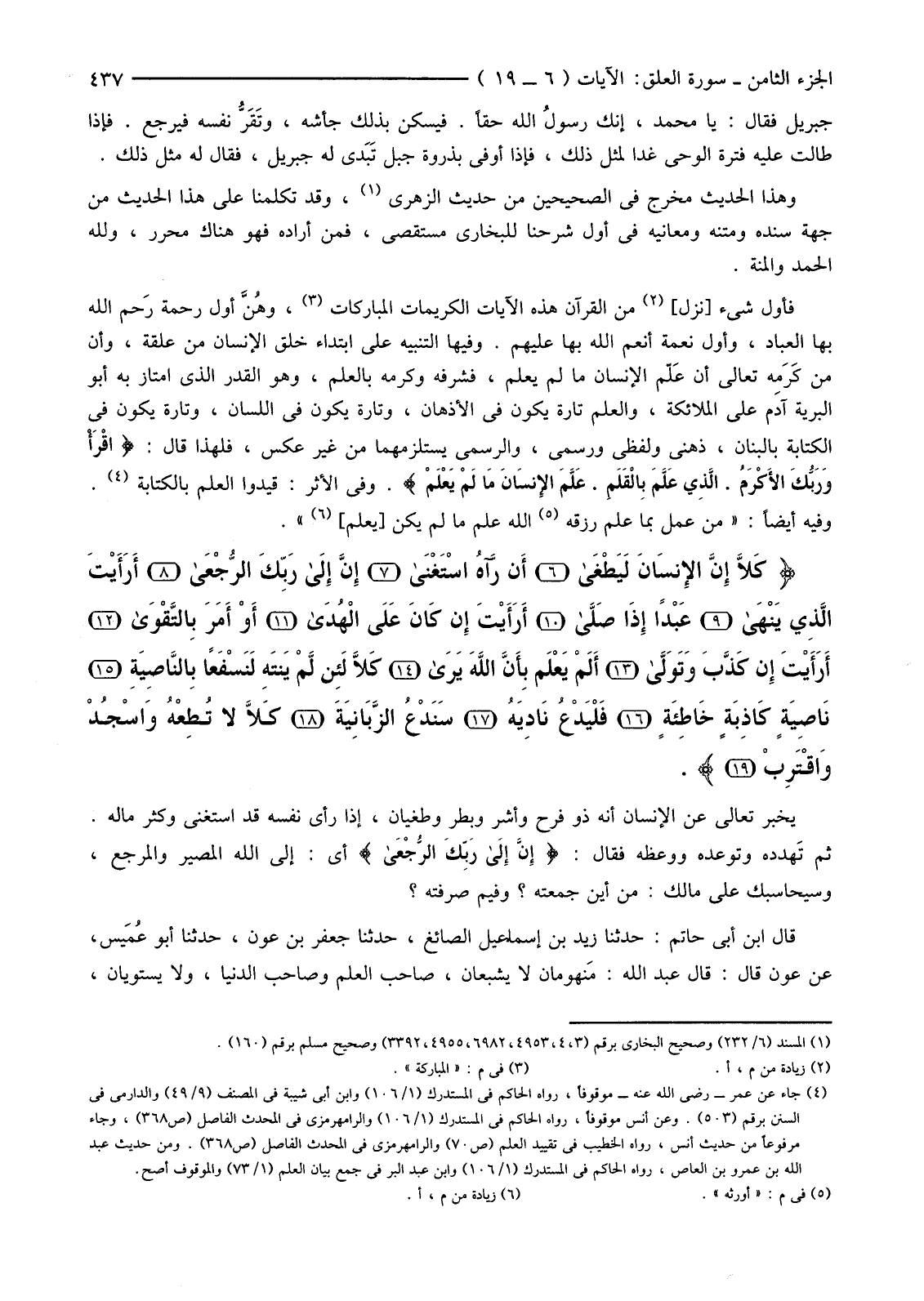 {كَلا إِنَّ الإنْسَانَ لَيَطْغَى (6) أَنْ رَآهُ اسْتَغْنَى (7) إِنَّ إِلَى رَبِّكَ الرُّجْعَى (8) أَرَأَيْتَ الَّذِي يَنْهَى (9) عَبْدًا إِذَا صَلَّى (10) أَرَأَيْتَ إِنْ كَانَ عَلَى الْهُدَى (11) أَوْ أَمَرَ بِالتَّقْوَى (12) أَرَأَيْتَ إِنْ كَذَّبَ وَتَوَلَّى (13) أَلَمْ يَعْلَمْ بِأَنَّ اللَّهَ يَرَى (14) كَلا لَئِنْ لَمْ يَنْتَهِ لَنَسْفَعًا بِالنَّاصِيَةِ (15) نَاصِيَةٍ كَاذِبَةٍ خَاطِئَةٍ (16) فَلْيَدْعُ نَادِيَهُ (17) سَنَدْعُ الزَّبَانِيَةَ (18) كَلا لَا تُطِعْهُ وَاسْجُدْ وَاقْتَرِبْ (19) }