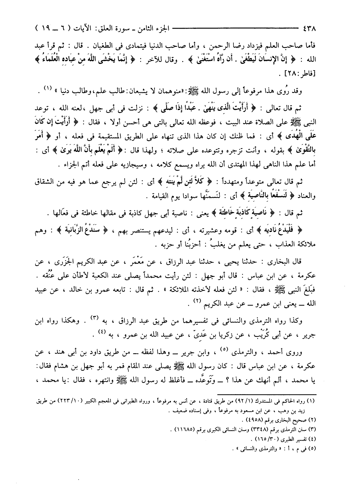 ثُمَّ قَالَ تَعَالَى: {أَرَأَيْتَ الَّذِي يَنْهَى عَبْدًا إِذَا صَلَّى} نَزَلَتْ فِي أَبِي جَهْلٍ، لَعَنَهُ اللَّهُ، تَوَعَّدَ النَّبِيَّ صَلَّى اللَّهُ عَلَيْهِ وَسَلَّمَ عَلَى الصَّلَاةِ عِنْدَ الْبَيْتِ، فَوَعَظَهُ اللَّهُ تَعَالَى بِالَّتِي هِيَ أَحْسَنُ أَوَّلًا فَقَالَ: {أَرَأَيْتَ إِنْ كَانَ عَلَى الْهُدَى} أَيْ: فَمَا ظَنُّكَ إِنْ كَانَ هَذَا الَّذِي تَنْهَاهُ عَلَى الطَّرِيقِ الْمُسْتَقِيمَةِ فِي فِعْلِهِ، أَوْ {أَمَرَ بِالتَّقْوَى} بِقَوْلِهِ، وَأَنْتَ تَزْجُرُهُ وَتَتَوَعَّدُهُ عَلَى صِلَاتِهِ؛ وَلِهَذَا قَالَ: {أَلَمْ يَعْلَمْ بِأَنَّ اللَّهَ يَرَى} أَيْ: أَمَا عَلِمَ هَذَا النَّاهِي لِهَذَا الْمُهْتَدِي أَنَّ اللَّهَ يَرَاهُ وَيَسْمَعُ كَلَامَهُ، وَسَيُجَازِيهِ عَلَى فِعْلِهِ أَتَمَّ الْجَزَاءِ.