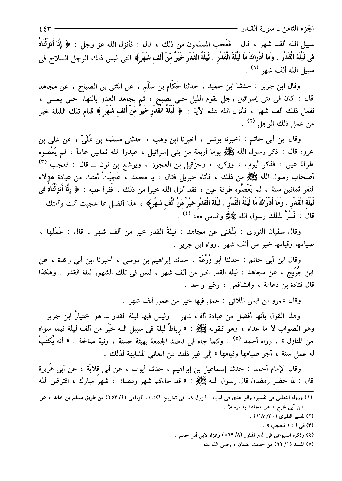 سَبِيلِ اللَّهِ أَلْفَ شَهْرٍ، قَالَ: فَعَجب الْمُسْلِمُونَ مِنْ ذَلِكَ، قَالَ: فَأَنْزَلَ اللَّهُ عَزَّ وَجَلَّ: {إِنَّا أَنزلْنَاهُ فِي لَيْلَةِ الْقَدْرِ وَمَا أَدْرَاكَ مَا لَيْلَةُ الْقَدْرِ لَيْلَةُ الْقَدْرِ خَيْرٌ مِنْ أَلْفِ شَهْرٍ} الَّتِي لَبِسَ ذَلِكَ الرَّجُلُ السِّلَاحَ فِي سَبِيلِ اللَّهِ أَلْفَ شَهْرٍ (1) .
