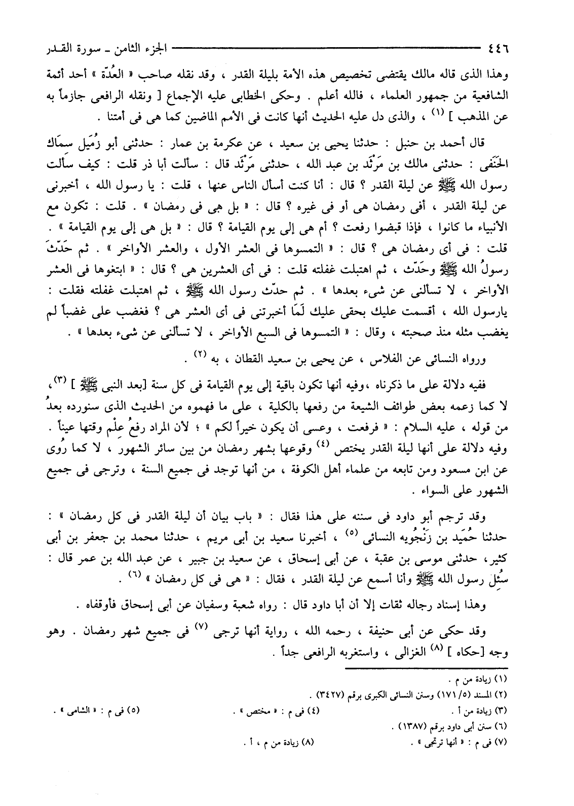 فَفِيهِ دَلَالَةٌ عَلَى مَا ذَكَّرْنَاهُ، وَفِيهِ أَنَّهَا تَكُونُ بَاقِيَةٌ إِلَى يَوْمِ الْقِيَامَةِ فِي كُلِّ سَنَةٍ [بَعْدَ النَّبِيِّ صَلَّى اللَّهُ عَلَيْهِ وَسَلَّمَ] (3) لَا كَمَا زَعَمَهُ بَعْضُ طَوَائِفِ الشِّيعَةِ مَنْ رَفْعِهَا بِالْكُلِّيَّةِ، عَلَى مَا فَهِمُوهُ مِنَ الْحَدِيثِ الَّذِي سَنُورِدُهُ بعدُ مِنْ قَوْلِهِ، عَلَيْهِ السَّلَامُ: "فَرُفِعَتْ، وَعَسَى أَنْ يَكُونَ خَيْرًا لَكُمْ"؛ لِأَنَّ الْمُرَادَ رفعُ عِلْم وَقْتِهَا عَيْنًا. وَفِيهِ دَلَالَةٌ عَلَى أَنَّهَا لَيْلَةُ الْقَدْرِ يَخْتَصُّ (4) وُقُوعُهَا بِشَهْرِ رَمَضَانَ مِنْ بَيْنِ سَائِرِ الشُّهُورِ، لَا كَمَا رُوي عَنِ ابْنِ مَسْعُودٍ وَمَنْ تَابَعَهُ مِنْ عُلَمَاءِ أَهْلِ الْكُوفَةِ، مِنْ أَنَّهَا تُوجَدُ فِي جَمِيعِ السَّنَةِ، وَتُرْجَى فِي جَمِيعِ الشُّهُورِ عَلَى السَّوَاءِ.