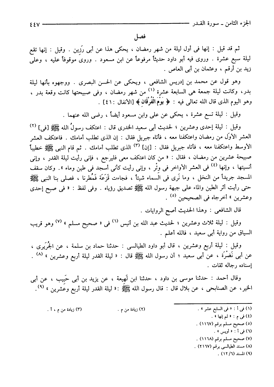 وَقِيلَ: لَيْلَةُ ثَلَاثٍ وَعِشْرِينَ؛ لِحَدِيثِ عَبْدِ اللَّهِ بْنِ أُنَيْسٍ (6) فِي "صَحِيحِ مُسْلِمٍ" (7) وَهُوَ قَرِيبُ السِّيَاقِ مِنْ رِوَايَةِ أَبِي سَعِيدٍ، فَاللَّهُ أَعْلَمُ.