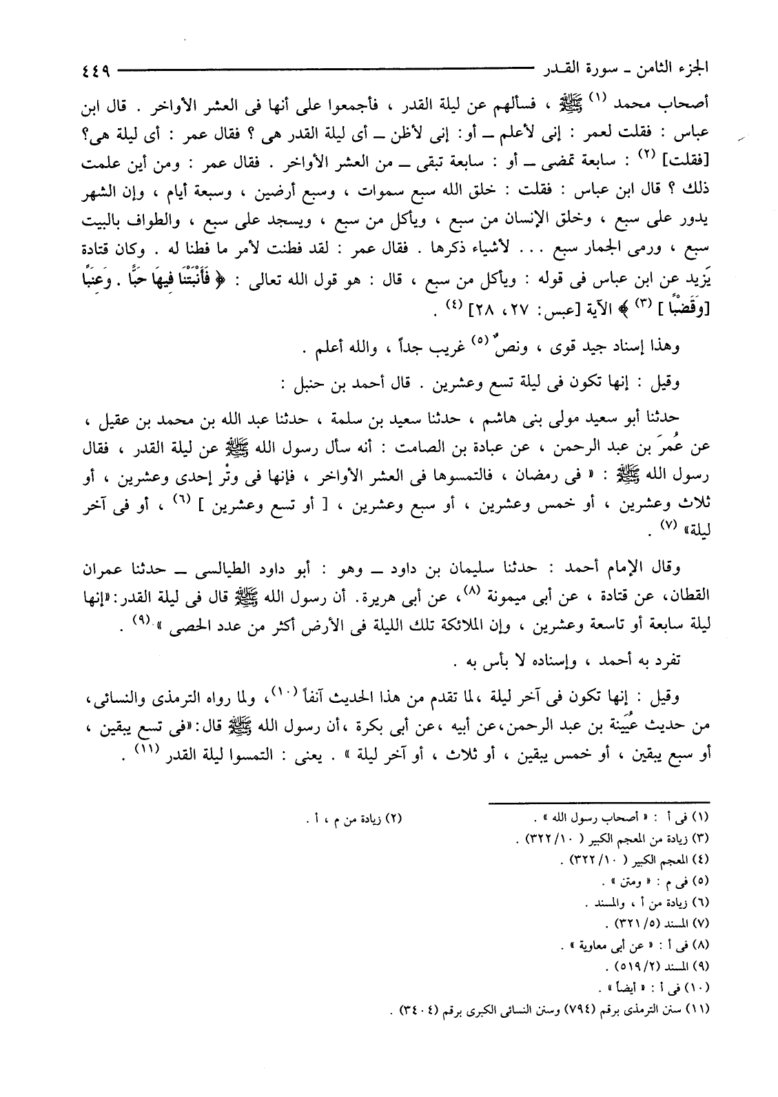 أَصْحَابَ مُحَمَّدٍ (1) صَلَّى اللَّهُ عَلَيْهِ وَسَلَّمَ، فَسَأَلَهُمْ عَنْ لَيْلَةِ الْقَدْرِ، فَأَجْمَعُوا عَلَى أَنَّهَا فِي الْعَشْرِ الْأَوَاخِرِ. قَالَ ابْنُ عَبَّاسٍ: فَقُلْتُ لِعُمَرَ: إِنِّي لَأَعْلَمُ -أَوْ: إِنِّي لَأَظُنُّ-أَيَّ لَيْلَةِ الْقَدْرِ هِيَ؟ فَقَالَ عُمَرُ: أَيُّ لَيْلَةٍ هِيَ؟ [فَقُلْتُ] (2) سَابِعَةٌ تَمْضِي -أَوْ: سَابِعَةٌ تَبْقَى-مِنَ الْعَشْرِ الْأَوَاخِرِ. فَقَالَ عُمَرُ: وَمَنْ أَيْنَ عَلِمْتَ ذَلِكَ؟ قَالَ ابْنُ عَبَّاسٍ: فَقُلْتُ: خَلَقَ اللَّهُ سَبْعَ سَمَوَاتٍ، وَسَبْعَ أَرْضِينَ، وَسَبْعَةَ أَيَّامٍ، وَإِنَّ الشَّهْرَ يَدُورُ عَلَى سَبْعٍ، وَخَلَقَ الْإِنْسَانَ مِنْ سَبْعٍ، وَيَأْكُلُ مِنْ سَبْعٍ، وَيَسْجُدُ عَلَى سَبْعٍ، وَالطَّوَافُ بِالْبَيْتِ سَبْعٌ، وَرَمْيُ الْجِمَارِ سَبْعٌ ... لِأَشْيَاءَ ذَكَرَهَا. فَقَالَ عُمَرُ: لَقَدْ فَطِنْتَ لِأَمْرٍ مَا فَطِنَّا لَهُ. وَكَانَ قَتَادَةُ يَزيد عَنِ ابْنِ عَبَّاسٍ فِي قَوْلِهِ: وَيَأْكُلُ مِنْ سَبْعٍ، قَالَ: هُوَ قَوْلُ اللَّهِ تَعَالَى: {فَأَنْبَتْنَا فِيهَا حَبًّا وَعِنَبًا [وَقَضْبًا] } (3) الْآيَةَ [عَبَسَ: 27، 28] (4) .