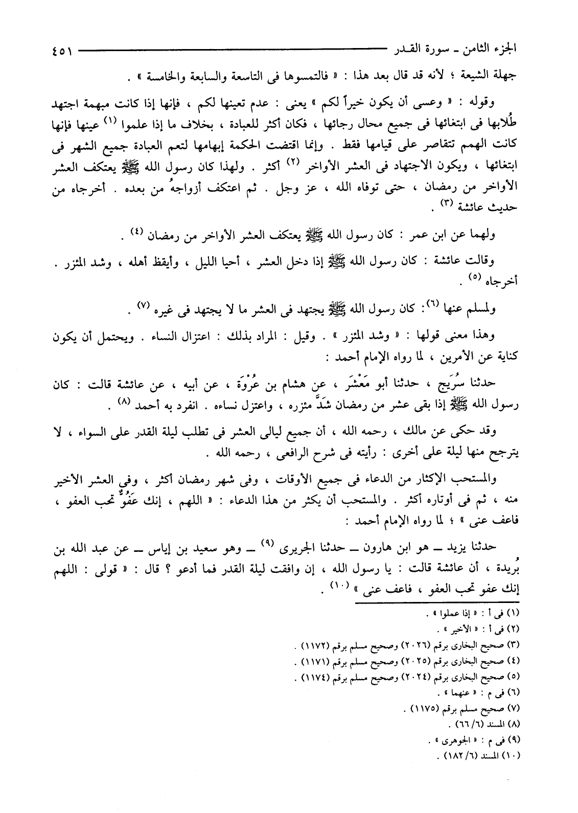 وَهَذَا مَعْنَى قَوْلِهَا: "وَشَدَّ الْمِئْزَرَ". وَقِيلَ: الْمُرَادُ بِذَلِكَ: اعْتِزَالُ النِّسَاءِ. وَيُحْتَمَلُ أَنْ يَكُونَ كِنَايَةً عَنِ الْأَمْرَيْنِ، لِمَا رَوَاهُ الْإِمَامُ أَحْمَدُ: